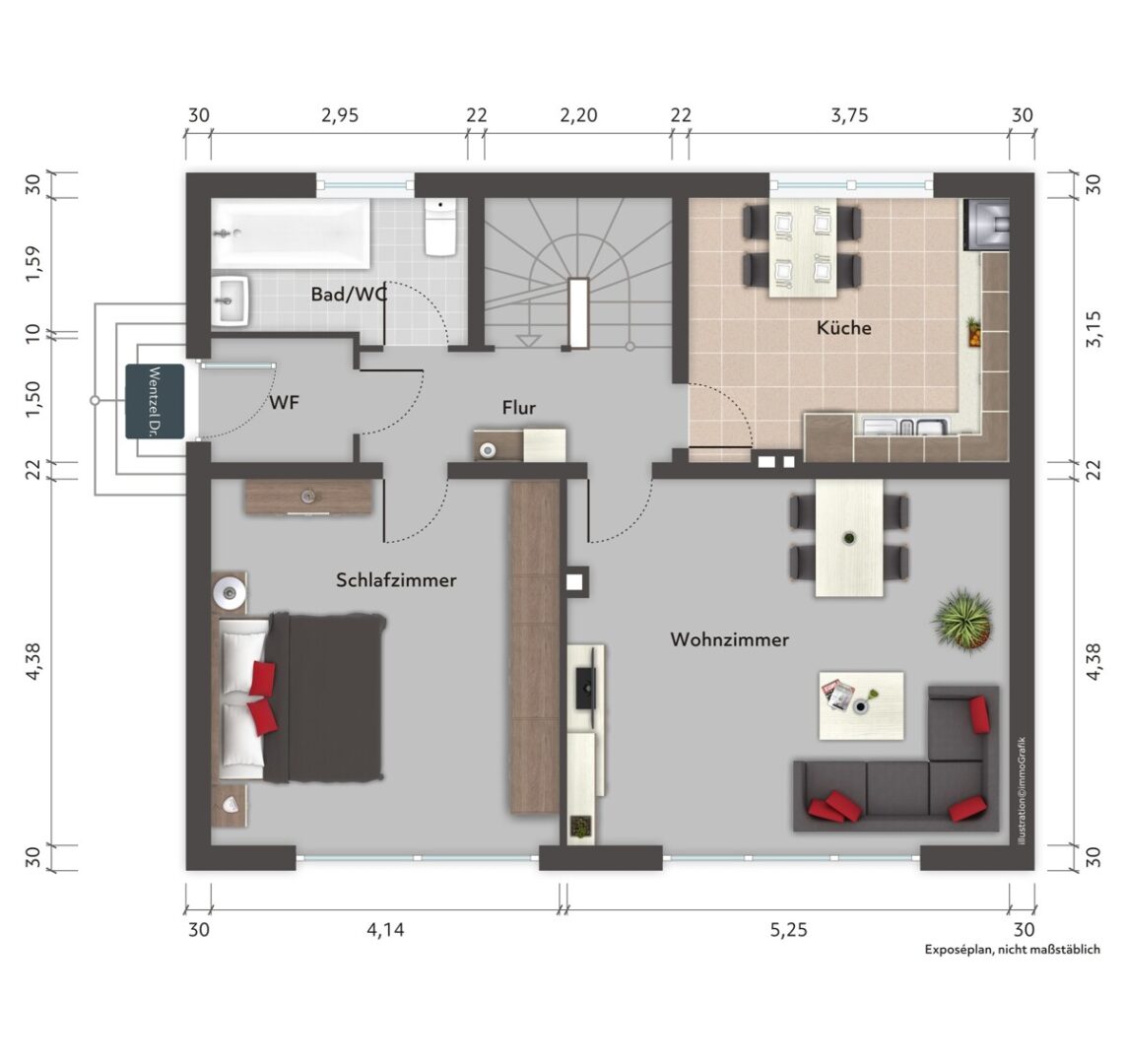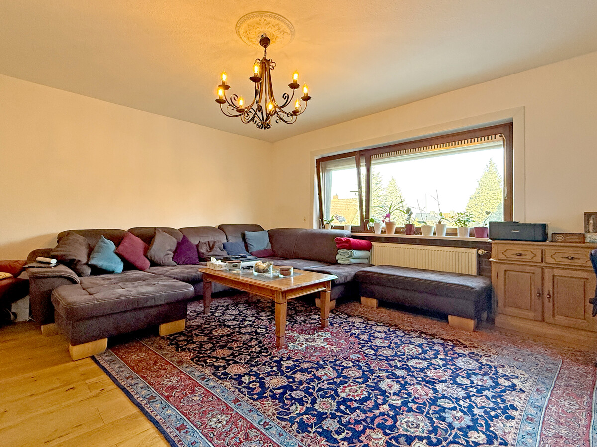 Der Wohnbereich wirkt großzügig und lichtbetont, geprägt von einem breiten Fensterband und einer ruhigen, harmonischen Proportion. Der Boden in Holzoptik unterstreicht den wohnlichen Eindruck, ohne sich in den Vordergrund zu drängen. Ein weiterer Raum im Erdgeschoss ergänzt das Angebot flexibel, etwa als Arbeitsbereich, Gäste- oder Schlafzimmer.