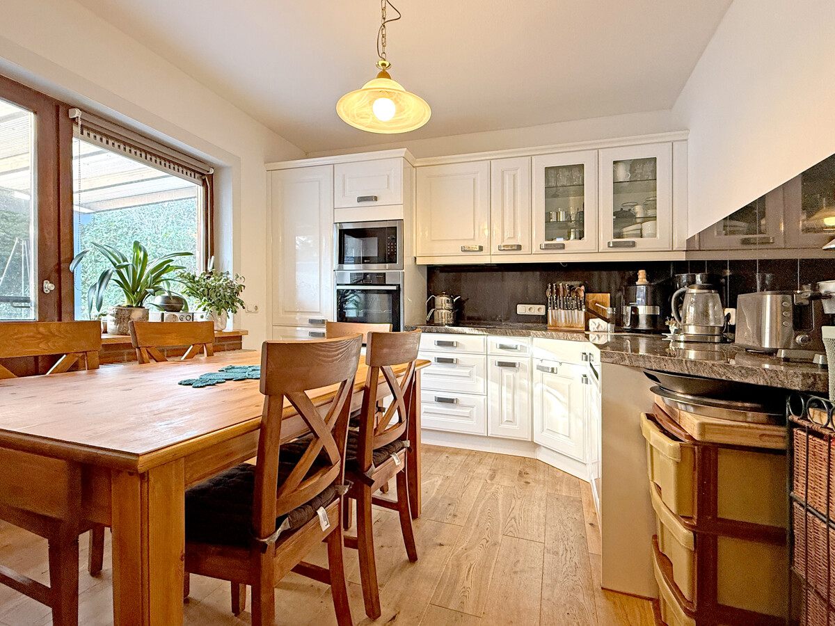Die Küche präsentiert sich als eigenständiger, einladender Mittelpunkt mit Essplatz und umfangreicher Einbauzeile in heller Frontgestaltung. Die Kombination aus klaren Linien, dunkler Arbeitsfläche und viel Stauraum schafft eine funktionale Umgebung, in der Kochen und Zusammensein selbstverständlich zusammenfinden. Ein Gäste WC mit Dusche im Erdgeschoss ergänzt den Alltag praktisch und ist in neutraler, gepflegter Ausführung gehalten.