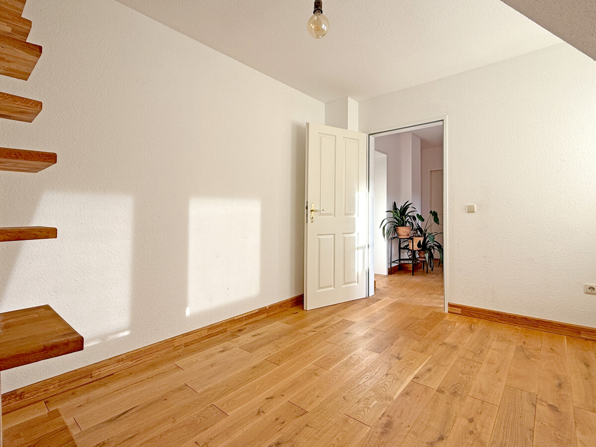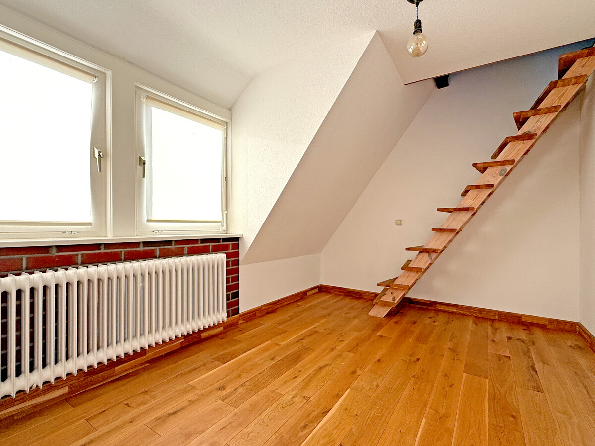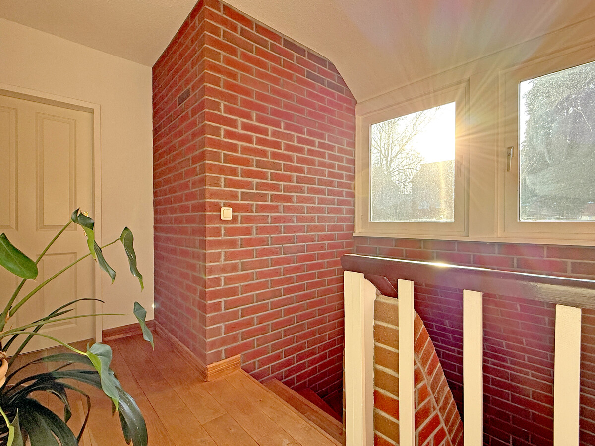 Über die Treppe gelangt man in das Obergeschoss, das durch sichtbares Mauerwerk und großzügige Fensterflächen eine besondere Atmosphäre erhält. Hier liegen mehrere Zimmer, die sich als Schlaf, Kinder oder Arbeitszimmer nutzen lassen und durch ihre Zuschnitte gut zu möblieren sind.