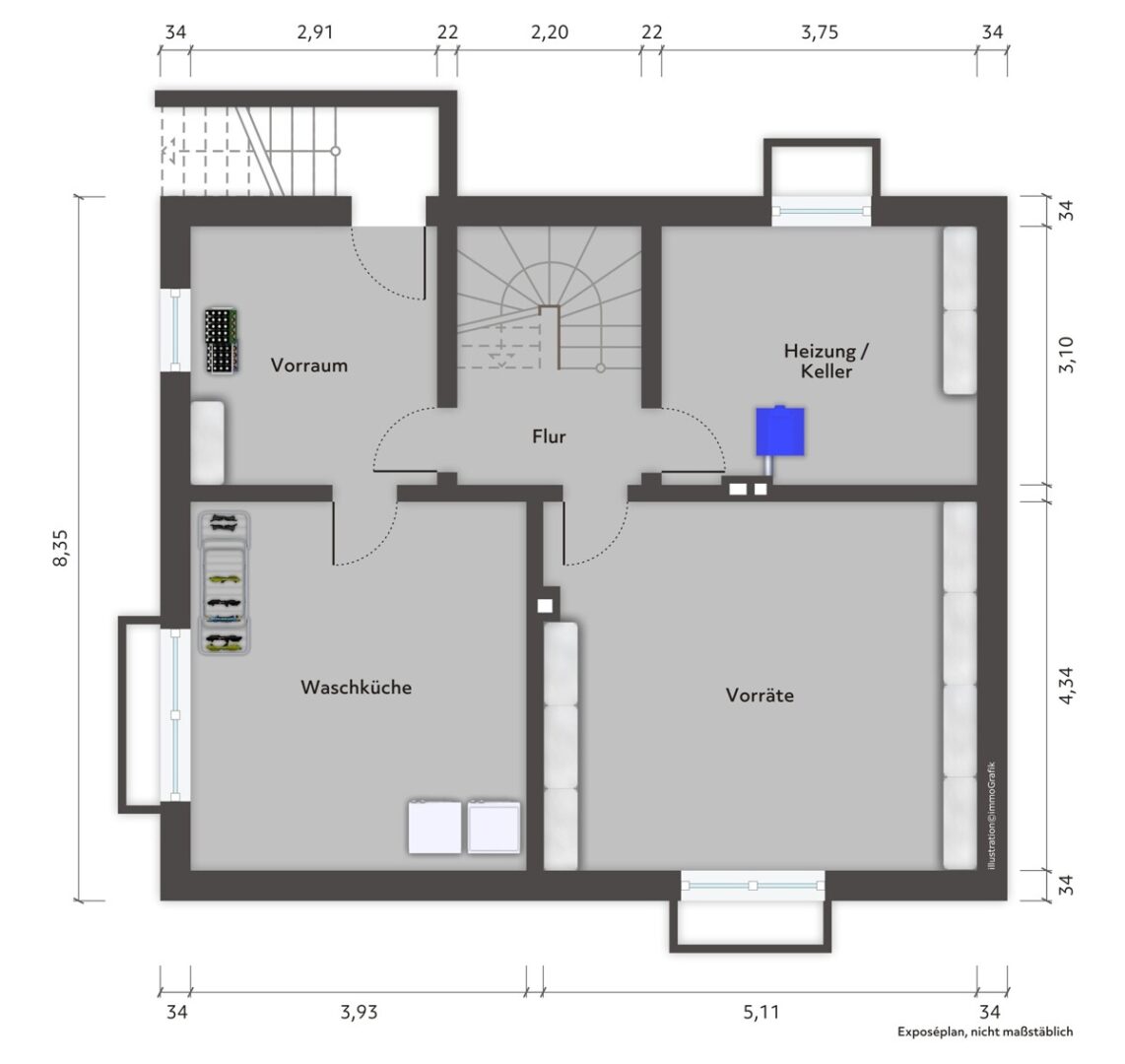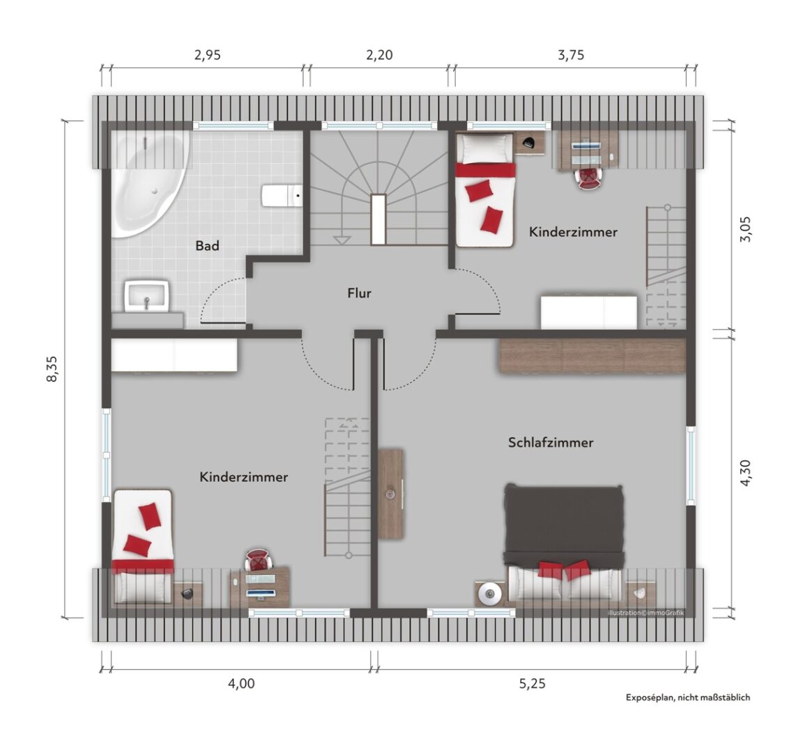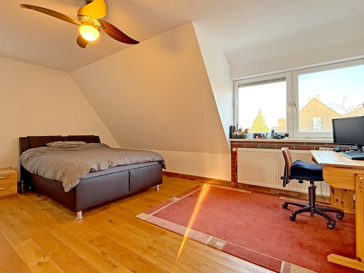 Über die Treppe gelangt man in das Obergeschoss, das durch sichtbares Mauerwerk und großzügige Fensterflächen eine besondere Atmosphäre erhält. Hier liegen mehrere Zimmer, die sich als Schlaf, Kinder oder Arbeitszimmer nutzen lassen und durch ihre Zuschnitte gut zu möblieren sind.