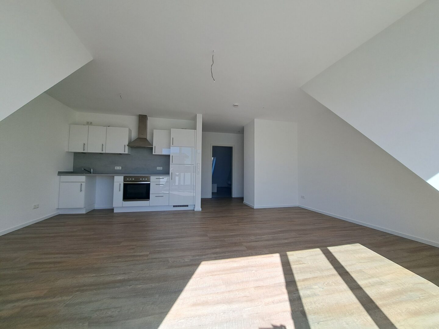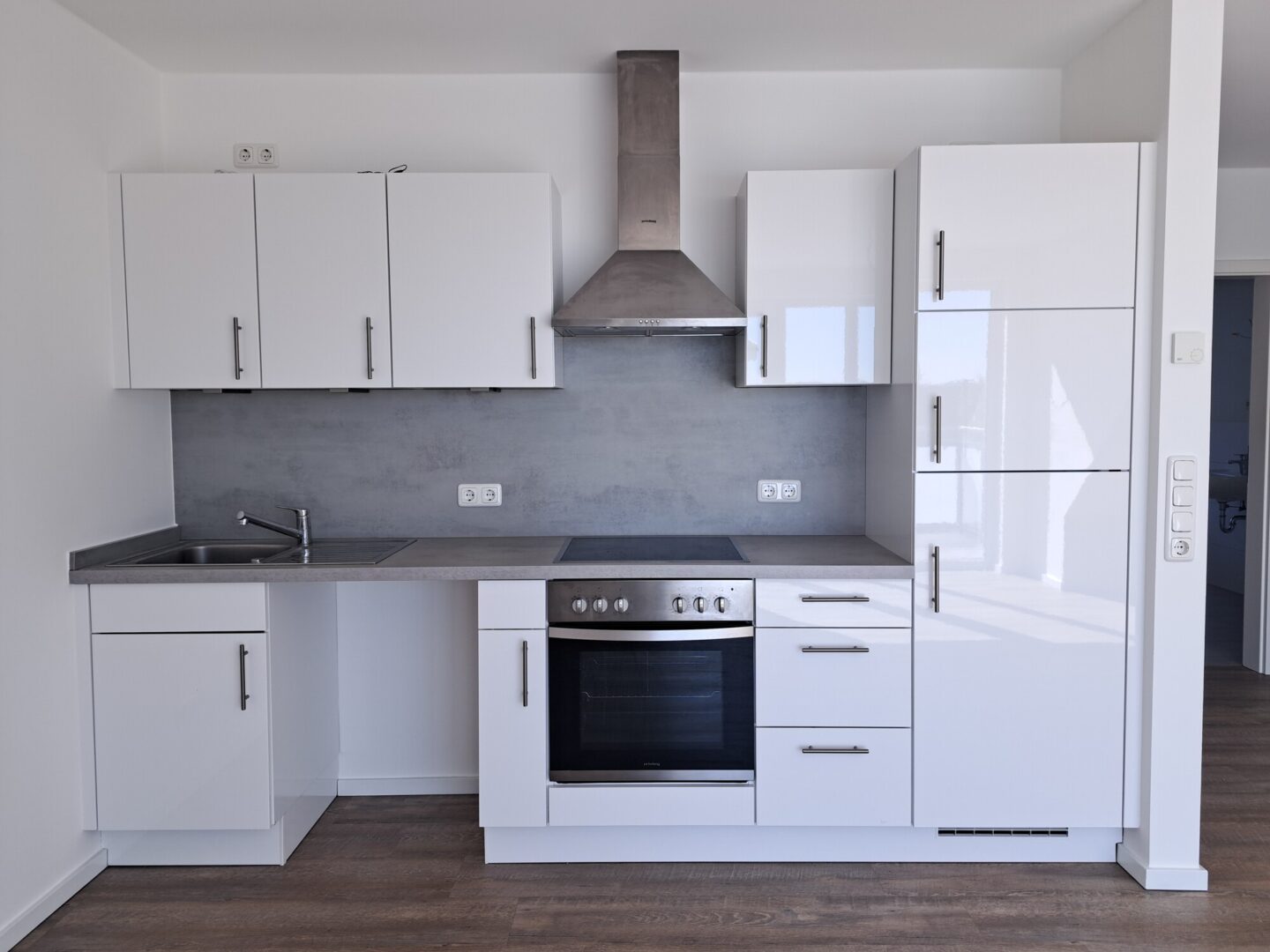 Die Wohnung befindet sich in der 3. Etage und überzeugt durch eine moderne sowie hochwertige Ausstattung. Sie verfügt über eine Einbauküche inklusive Kühlschrank, Backofen, Herd und Umlufthaube, die offen in den Wohnbereich integriert ist.