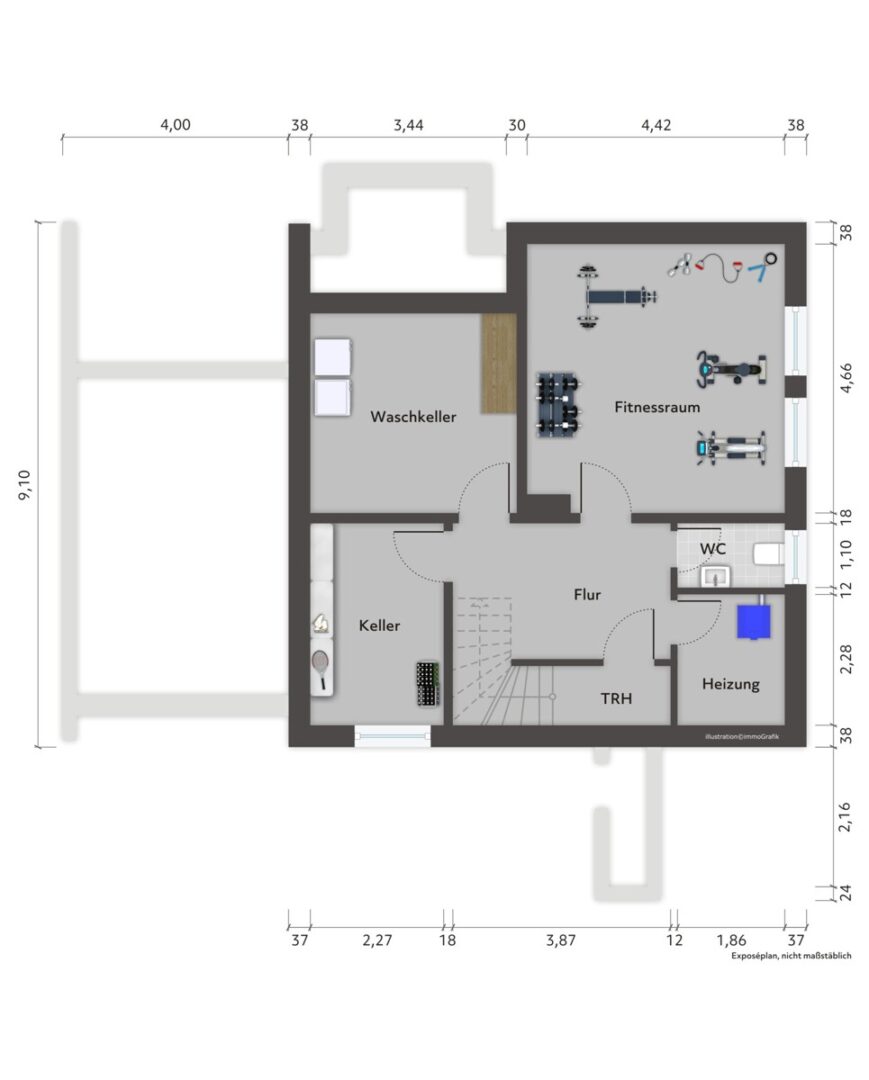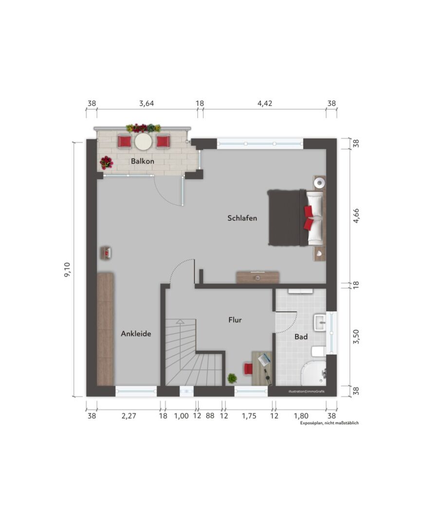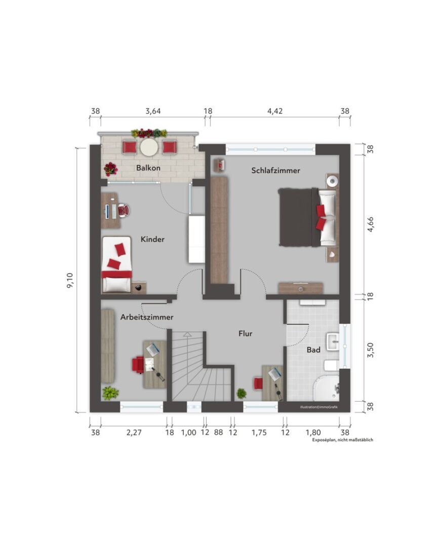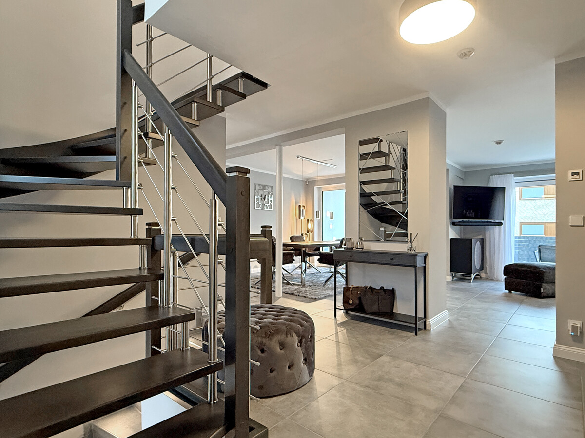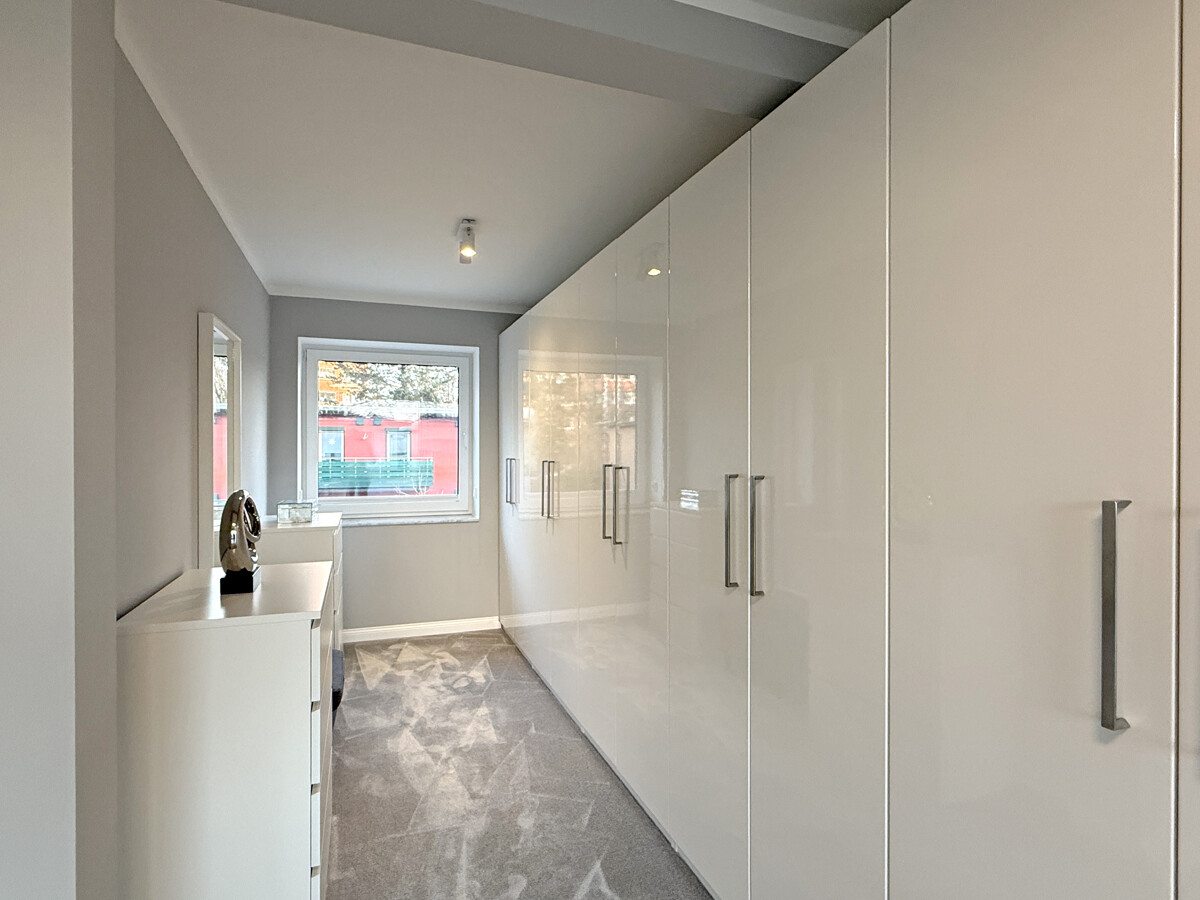 Das Schlafzimmer ist mit einem textilen Bodenbelag ausgestattet und verfügt über einen separaten Ankleidebereich. Ergänzt wird das Raumangebot durch einen Flur- bzw. Bürobereich. Eine moderne Treppenanlage mit Holzstufen und Metallgeländer verbindet die Etagen. Ein Keller bietet zusätzliche Nutz- und Abstellflächen.