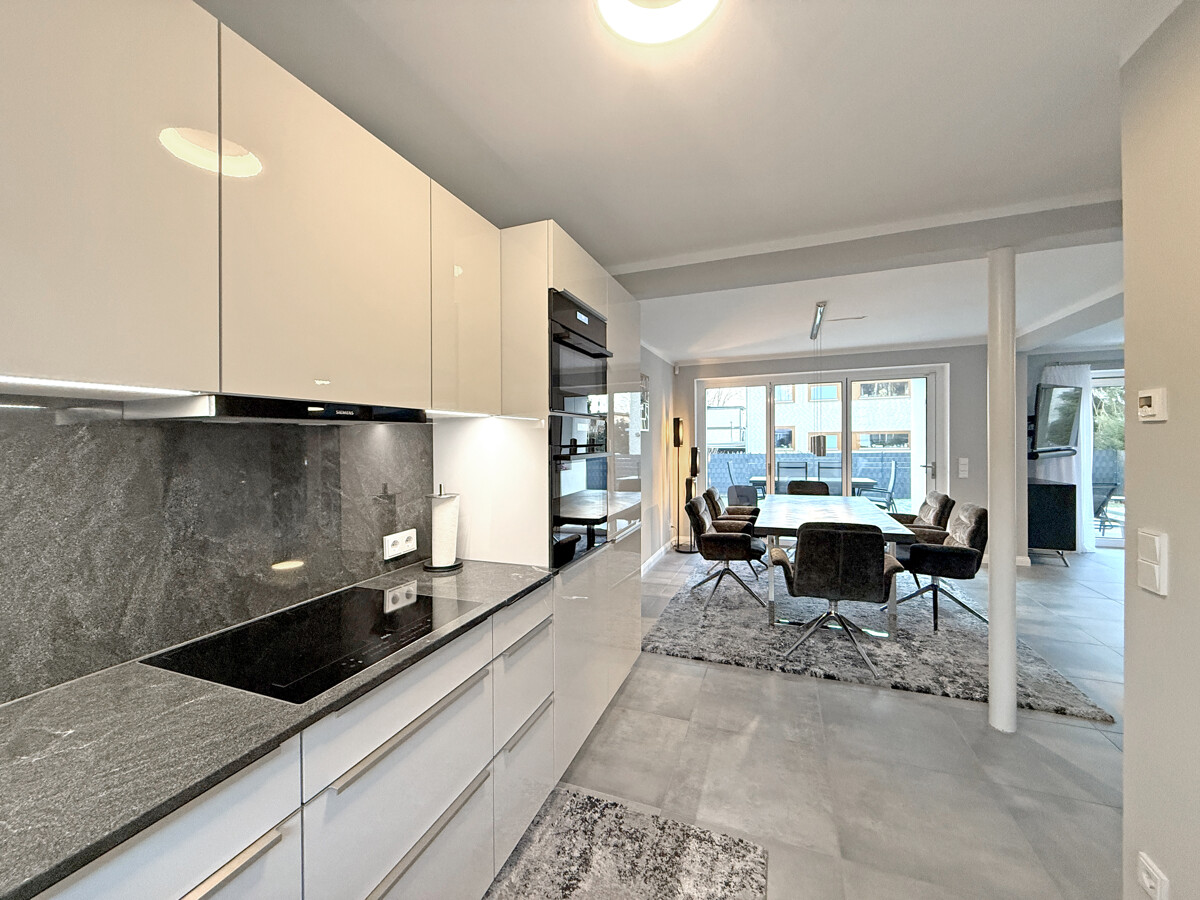 Die moderne Einbauküche verfügt über glatte Fronten, eine dunkle Arbeitsplatte sowie Einbaugeräte in praktischer Hochschranklösung mit Backofen und Mikrowelle. Unterbauleuchten sorgen für eine angenehme Arbeitsbeleuchtung.