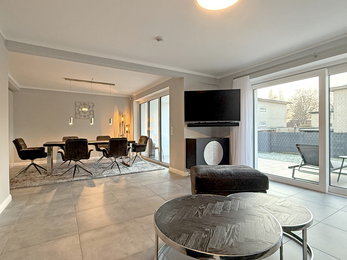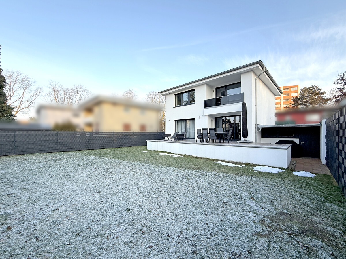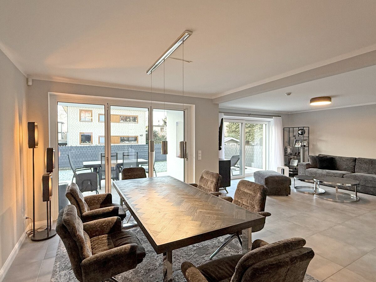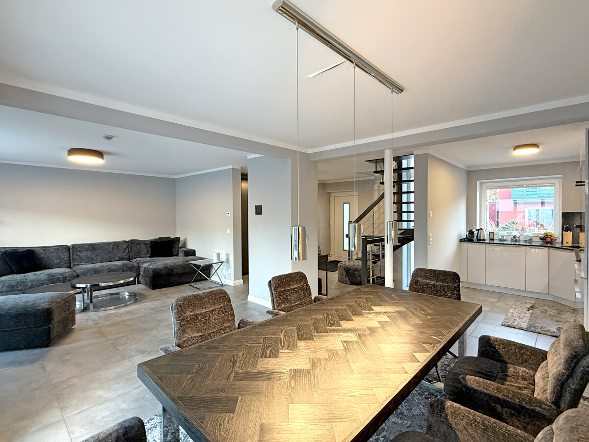 Der offen gestaltete Wohn- und Essbereich bildet das Herzstück des Hauses und ist mit großformatigen Bodenfliesen in grauer Optik ausgestattet. Großzügige Fensterflächen sowie bodentiefe Schiebeelemente sorgen für viel Tageslicht und ermöglichen den direkten Zugang zur Terrasse und in den Garten. Ein Balkon ergänzt die Außenflächen und bietet zusätzlichen Freiraum.