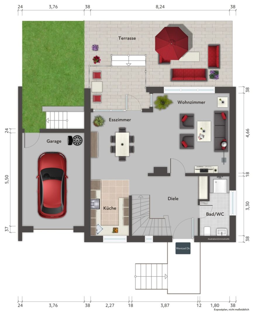 Der Außenbereich kombiniert befestigte Flächen mit einem großen Gartenanteil, einer Terrasse und einem Balkon. Die Immobilie befindet sich in sehr gepflegtem Zustand und ist zudem noch sehr modern und energieeffizient saniert worden.