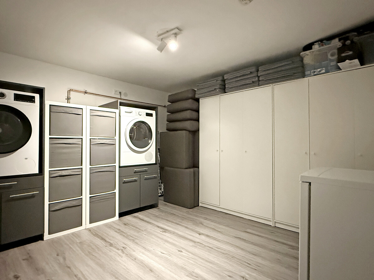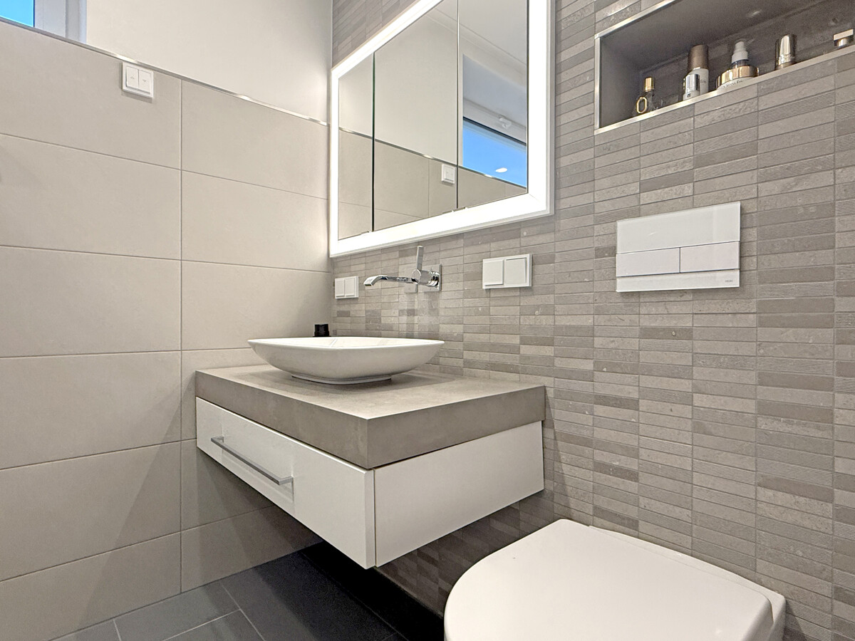 Im Erdgeschoss befindet sich ein hochwertiges Badezimmer mit bodengleicher Dusche, großformatigen Wand- und Bodenfliesen, wandhängendem WC, moderner Waschtischanlage, beleuchtetem Spiegel sowie Handtuchheizkörper. Ein weiteres Badezimmer im Obergeschoss bietet zusätzlichen Komfort.