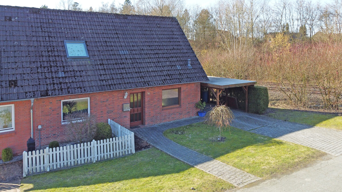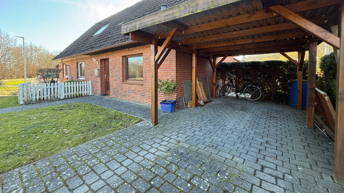 Ein praktischer Carport direkt neben dem Haus sowie der längliche, pflegeleichte Garten bieten Platz für Freizeit, Spiel oder Gartenarbeit. Die Sackgassenlage sorgt zusätzlich für ein hohes Maß an Privatsphäre.