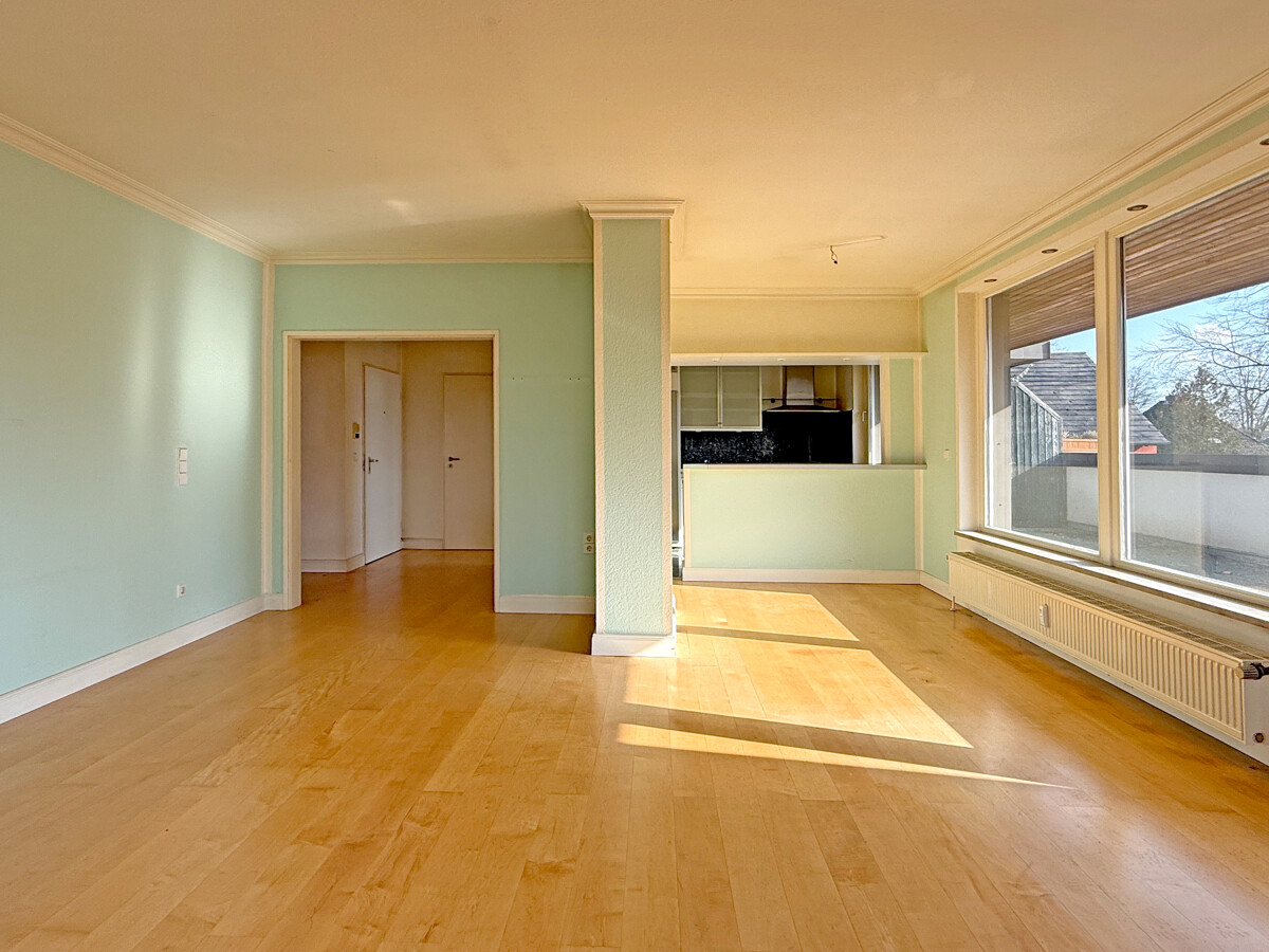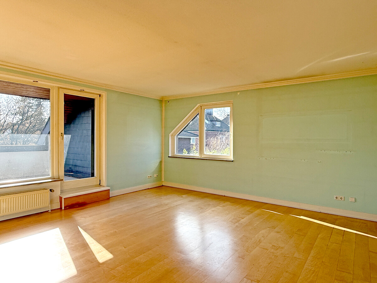 Der Wohnbereich bildet den Mittelpunkt der Wohnung und wirkt durch die Dachgeschosslage besonders atmosphärisch. Der direkte Zugang zu dem großen Südbalkon erweitert den Raum nach außen und schafft einen ruhigen Rahmen für Frühstück, Abendlicht oder eine kurze Pause zwischen Terminen.
