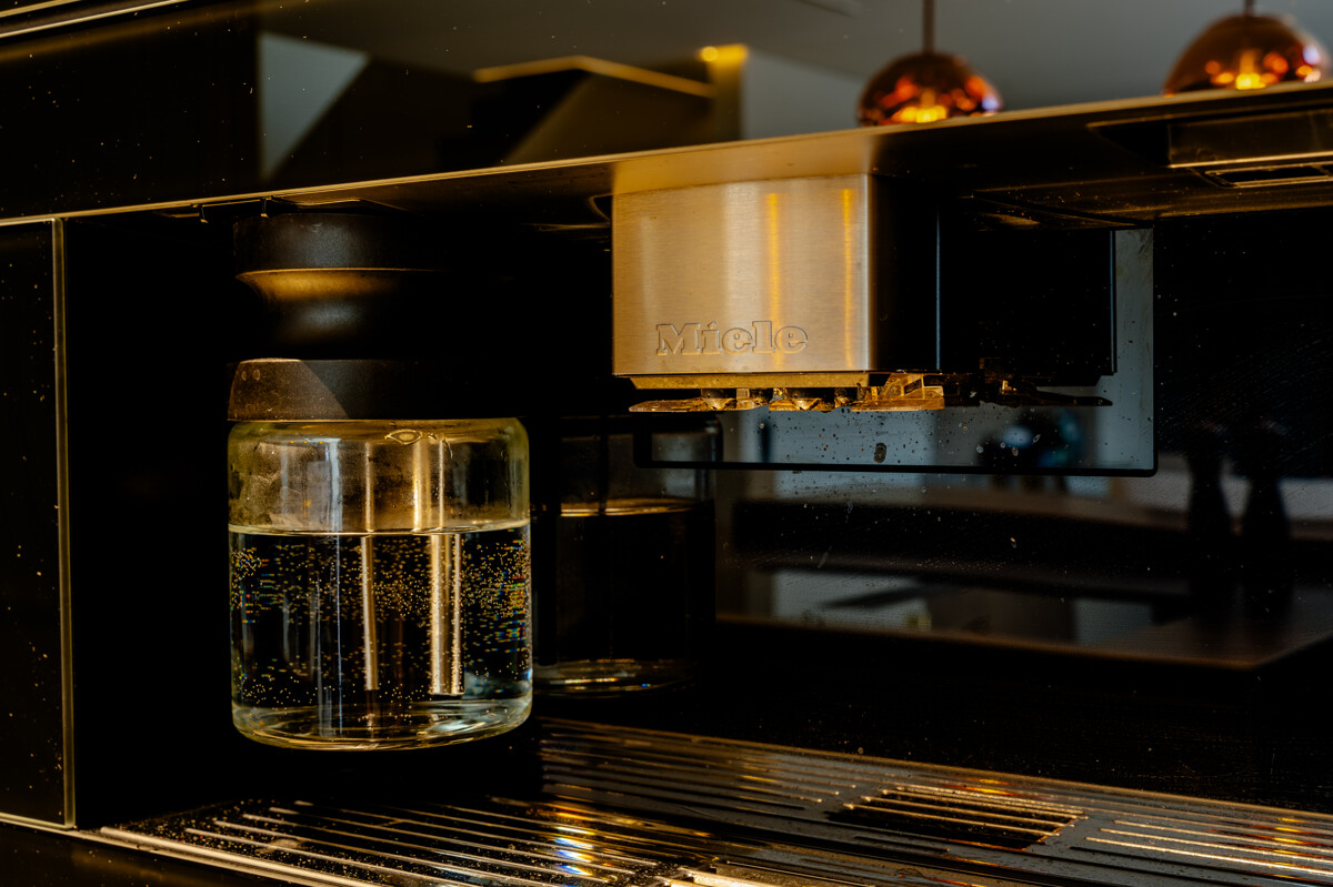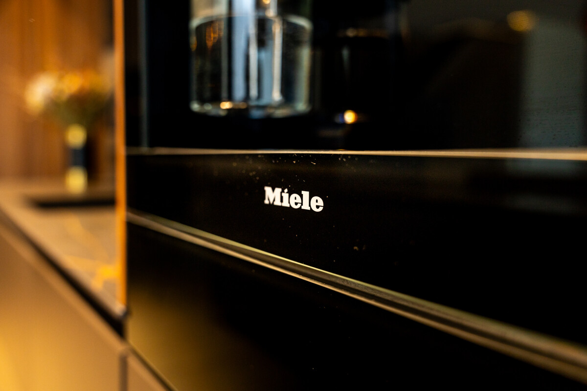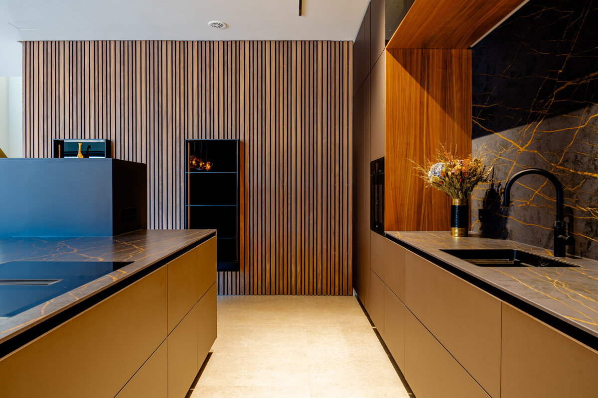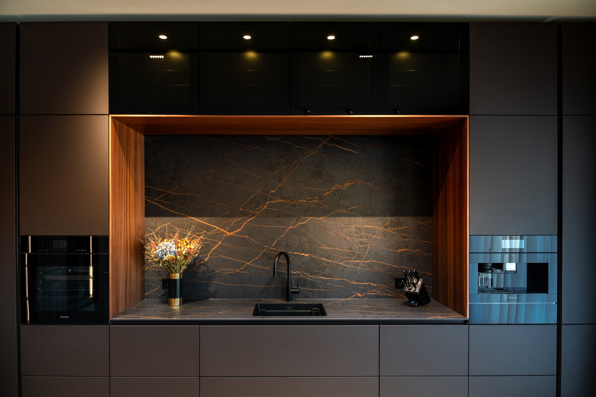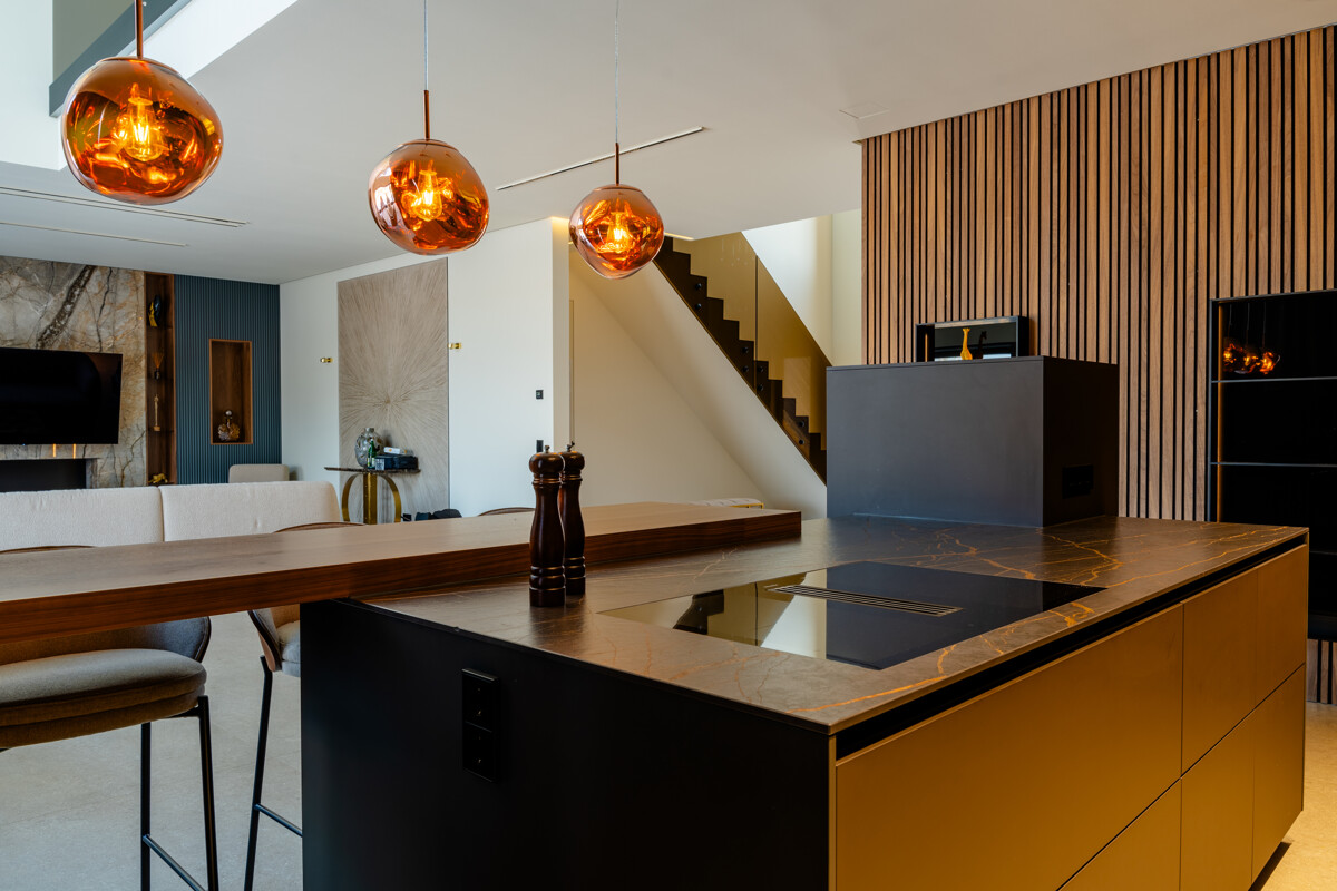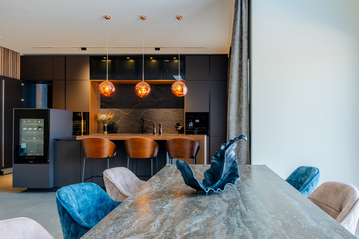 Im Herzen des Hauses befindet sich der großflächige Wohnbereich mit offener Decke, raumhohen Fenstern und hochwertigen Einbauelementen aus Nussbaumholz. Ein Etanolkamin, umrandet von Spiegelmarmor, schafft eine elegante und warme Wohnatmosphäre. Die angrenzende Luxusküche von "Next" setzt gestalterische und funktionale Maßstäbe. Mit einer Schieferarbeitsplatte und modernsten Miele-Geräten – darunter Warmhalter, Dampfgarer, Kaffeevollautomat, Weinkühlschrank, Eismaschine und ein Quooker-System – erfüllt sie höchste Ansprüche und fügt sich harmonisch in das großzügige Raumkonzept ein.