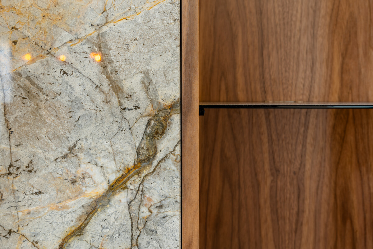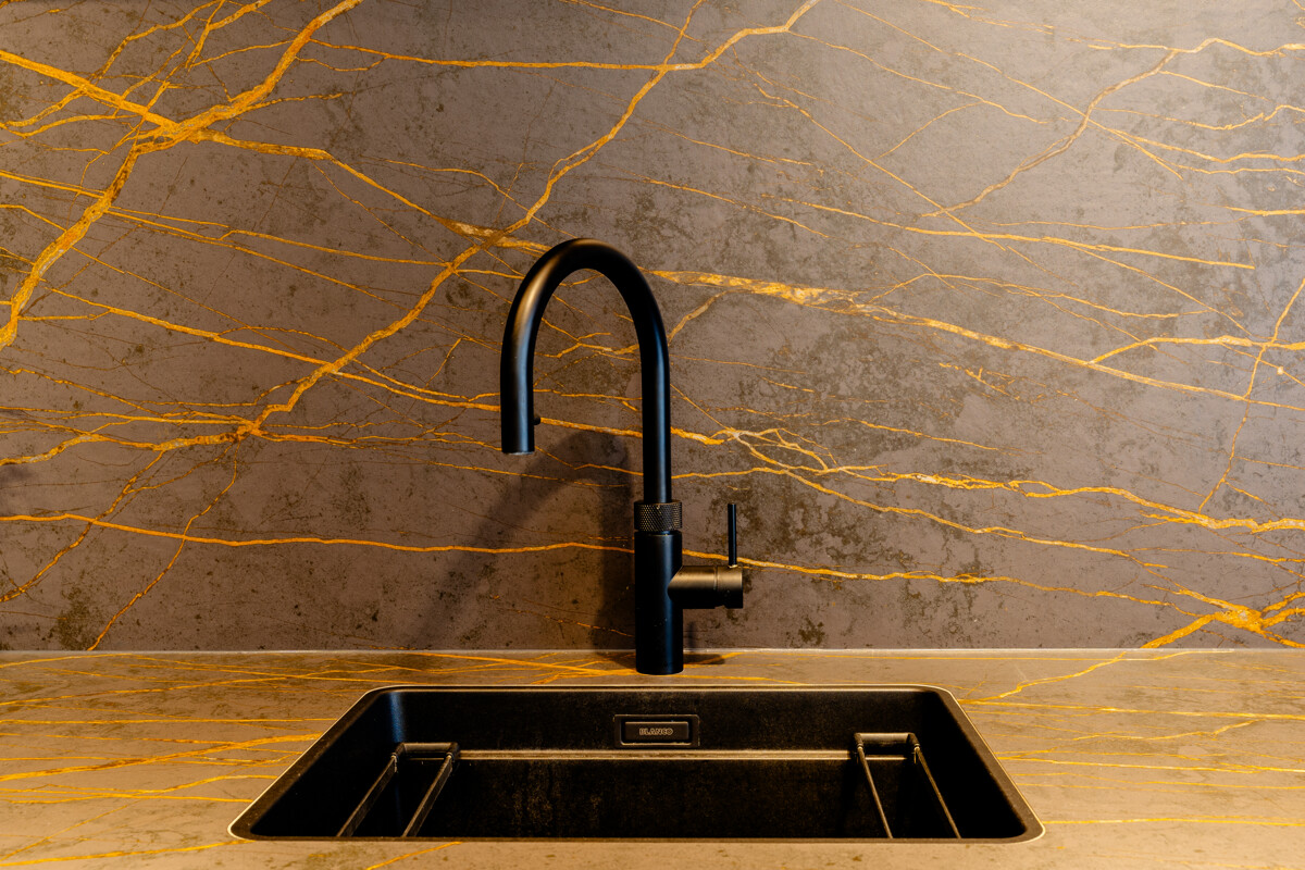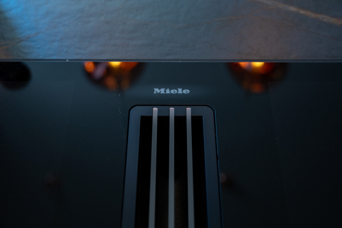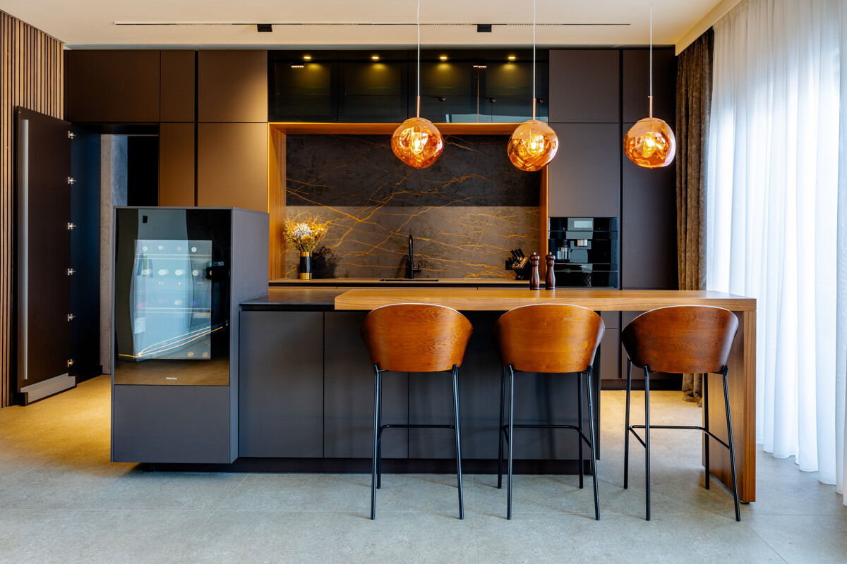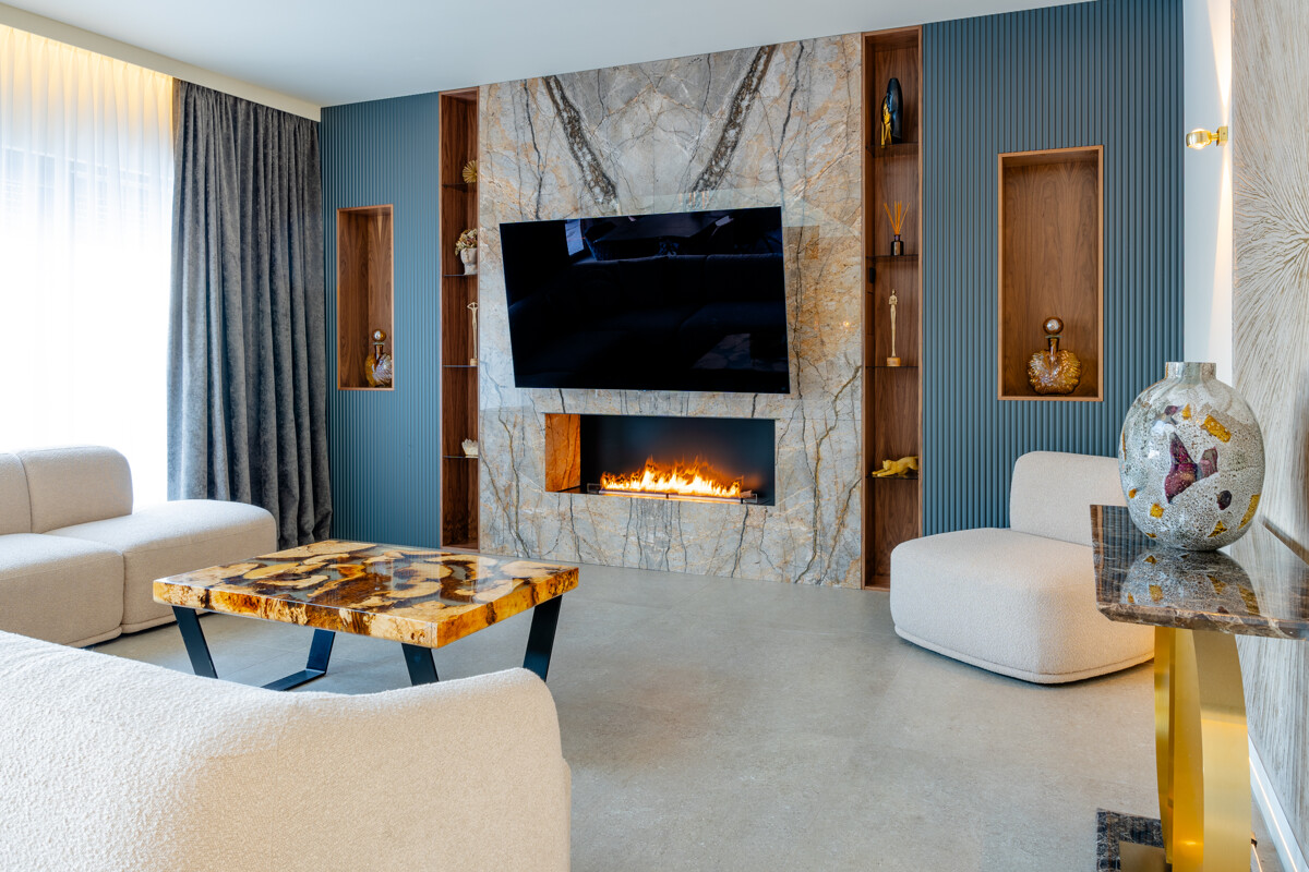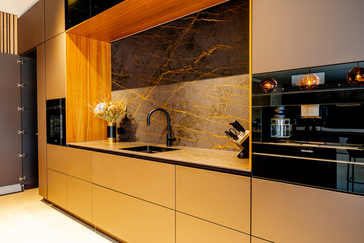 Im Herzen des Hauses befindet sich der großflächige Wohnbereich mit offener Decke, raumhohen Fenstern und hochwertigen Einbauelementen aus Nussbaumholz. Ein Etanolkamin, umrandet von Spiegelmarmor, schafft eine elegante und warme Wohnatmosphäre. Die angrenzende Luxusküche von "Next" setzt gestalterische und funktionale Maßstäbe. Mit einer Schieferarbeitsplatte und modernsten Miele-Geräten – darunter Warmhalter, Dampfgarer, Kaffeevollautomat, Weinkühlschrank, Eismaschine und ein Quooker-System – erfüllt sie höchste Ansprüche und fügt sich harmonisch in das großzügige Raumkonzept ein.