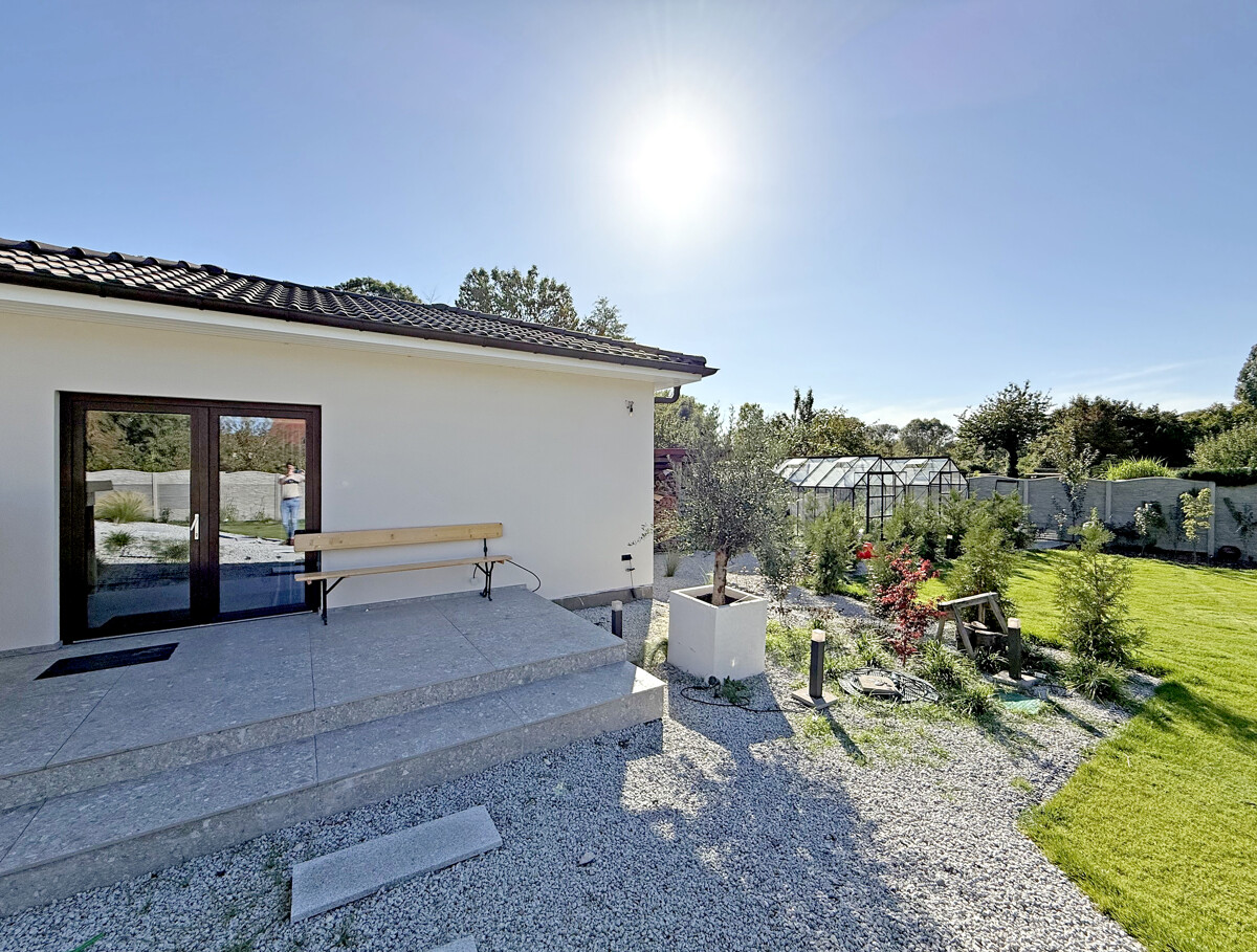 Auch technisch präsentiert sich die Villa auf modernstem Niveau. Eine effiziente Erdwärmepumpe, dreifach verglaste Fenster und elektrische Aluminium-Außenjalousien sorgen für hervorragende Energieeffizienz und Wohnkomfort. Eine umfassende Alarmanlage sowie Videoüberwachung bieten zusätzliche Sicherheit. Die über die gesamte Hausbreite verlaufende Terrasse ist teilweise überdacht, verschattbar und verfügt über elektrische Lamellen sowie integrierte Beleuchtung.