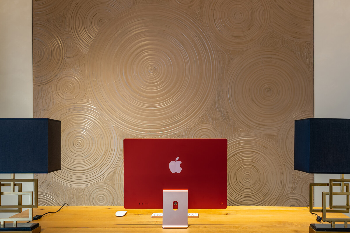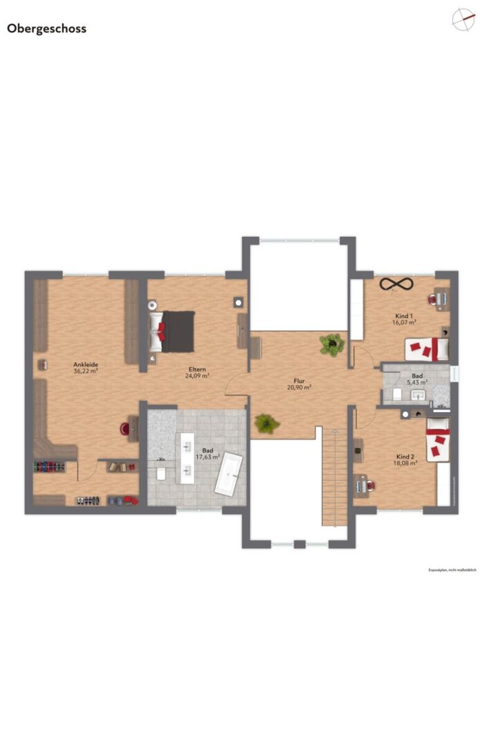 Das Obergeschoss wird von einer offenen Galerie geprägt, die den Blick in den Wohnbereich freigibt und das lichtdurchflutete Ambiente unterstreicht. Die Deckenhöhe von 3,20 Metern verstärkt auch im Obergeschoss den Eindruck von Weite. Die Kinderzimmer verfügen über ein eigenes Bad, während der Hauptschlafraum mit einer großzügigen Ankleide und maßgefertigten Einbauten punktet. Das luxuriöse Masterbad folgt in der Gestaltung einem zeitlos eleganten Konzept, das durch fugenlose Wand- und Bodenflächen eine besonders großzügige Raumwirkung entfaltet. Hochwertige Messingarmaturen in Mattgold von Herzblatt bilden einen stilvollen Kontrast zu den puristischen Flächen und verleihen dem Badezimmer eine warme, exklusive Note. Die freistehende Badewanne wird zum skulpturalen Mittelpunkt des Raumes.