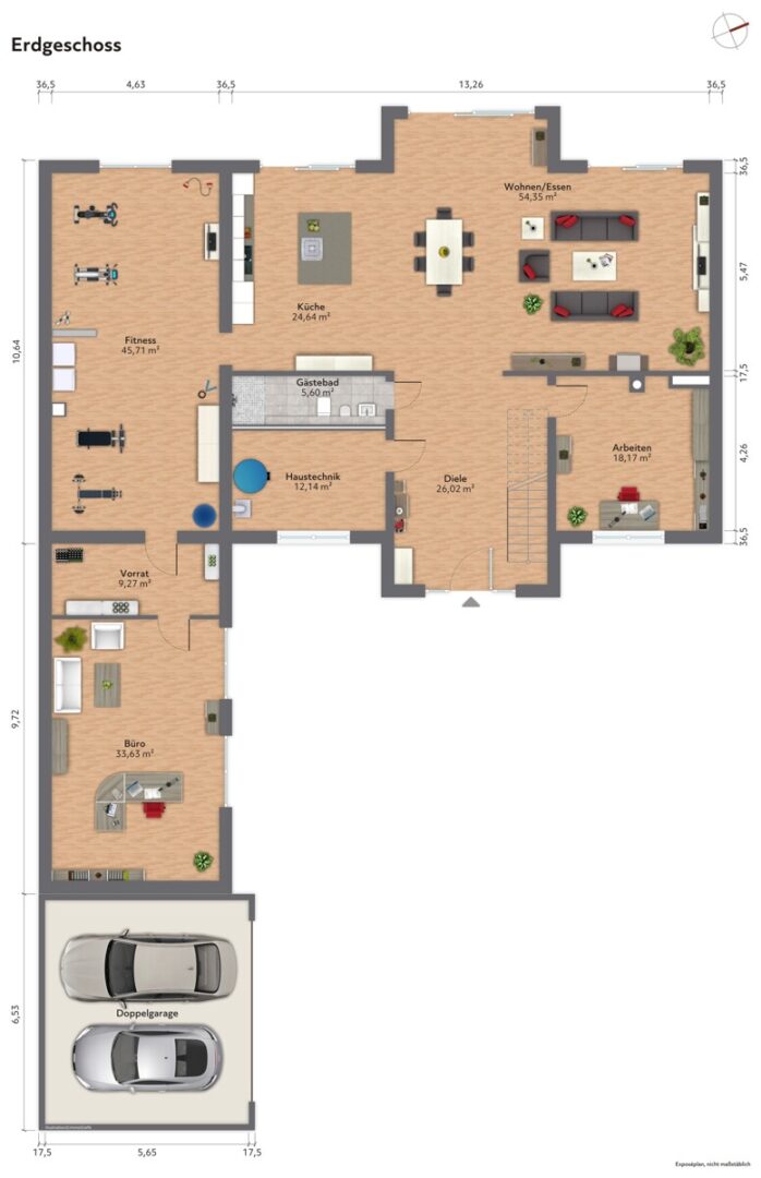 Ergänzt wird das Raumangebot durch ein ca. 48 m² großes Gartenhaus mit eigener Küche und Badezimmer – ideal für Gäste, Feste oder als separater Rückzugsort. Eine vollständig umschlossene Garage mit elektrischem Tor bietet Platz für bis zu vier Fahrzeuge.