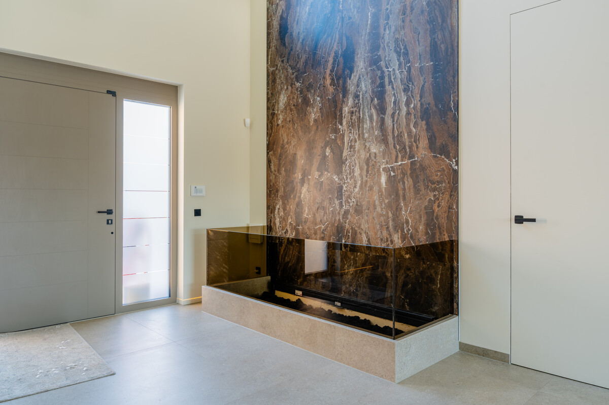 Der im Jahr 2023 fertiggestellte Neubau bietet auf ca. 428 m² Wohnfläche ein Ambiente, das durch Großzügigkeit, Licht und klare Linien geprägt ist. Bereits beim Betreten öffnet sich ein eindrucksvolles Entrée mit einer Raumhöhe von bis zu 6,60 Metern, in dem ein integrierter Wasserfall als architektonisches Highlight die besondere Atmosphäre des Hauses widerspiegelt. Das gesamte Erdgeschoss ist mit edlen Marazzi-Marmorfliesen ausgestattet, die den offenen Wohn- und Kochbereich perfekt in Szene setzen.
