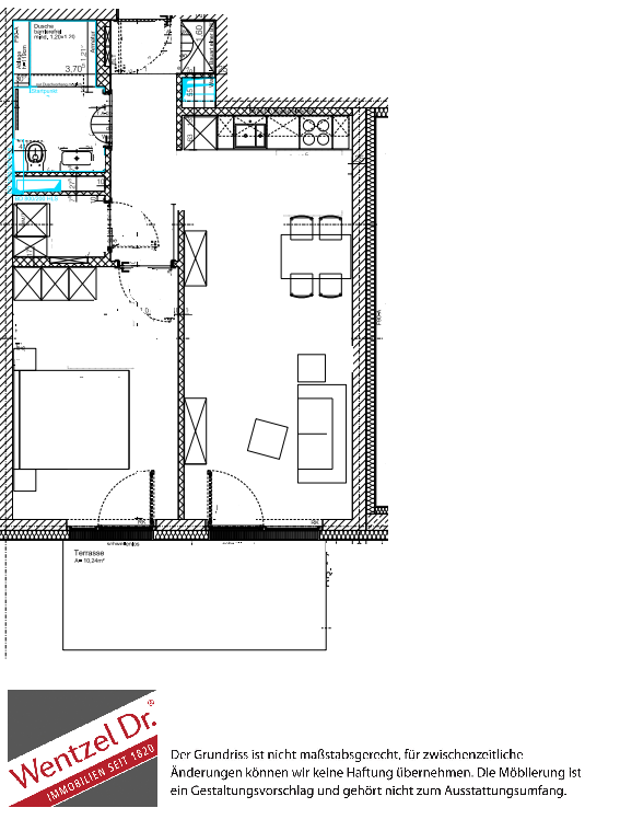 Diese schöne Wohnung zeichnet sich durch eine moderne und zeitlose Austattung aus. Die Wohnung ist mit einer Einbauküche ausgestattet, welche offen zum Wohnbereich liegt. Das Duschbad ist modern gefliest und verfügt über einen Handtuchheizkörper, Die gesamte Wohnung ist mit einem Parkettfussboden verlegt. Vom Wohnzimmer und Schlafzimmer gelangen Sie auf die Terrasse, auf der Sie im Sommer die Sonne genießen können. Ein Abstellraum mit Waschmaschinenanschluss ist ebenfalls in der Wohnung vorhanden. Als Abstellfläche steht dem Mieter ein Kellerraum zur Verfügung.