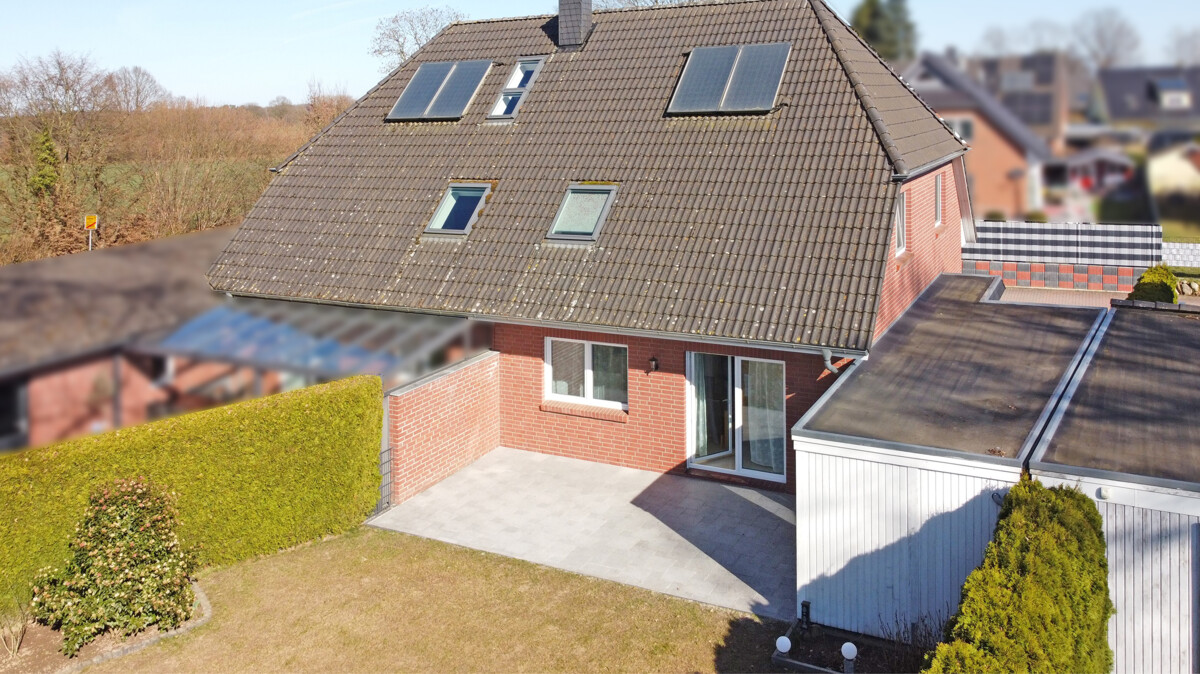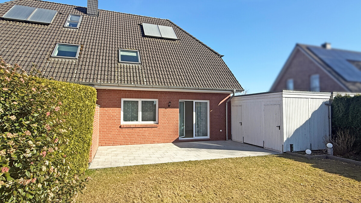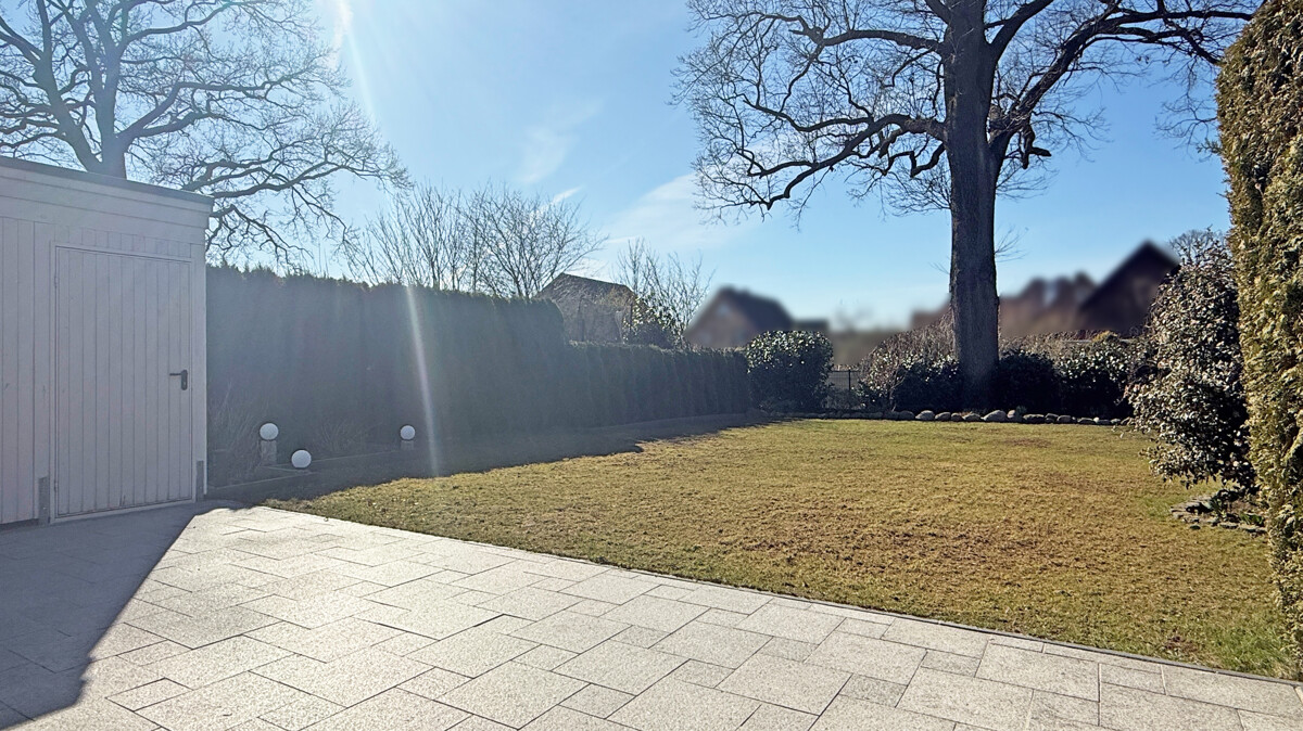 Der Außenbereich bietet eine großzügige Terrassenfläche sowie eine weitläufige Rasenfläche, eingefasst von gewachsenen Hecken, die für Privatsphäre sorgen. Ein Gartenhaus ergänzt das Angebot um praktischen Stauraum für Geräte und saisonale Utensilien.