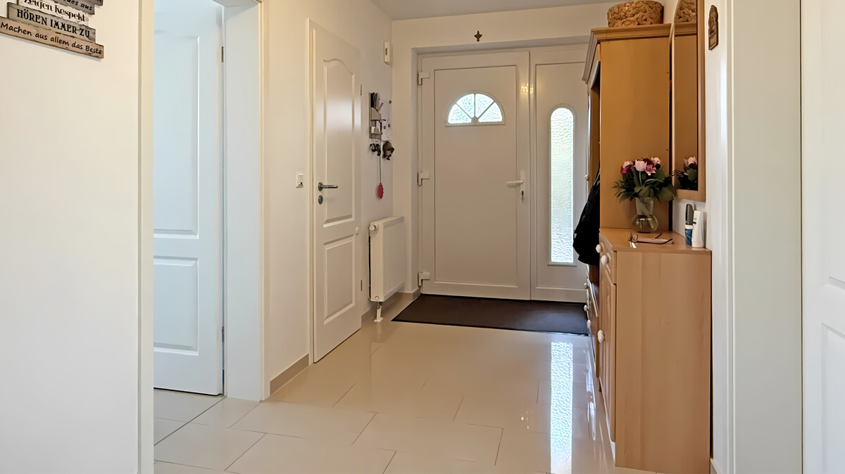 Auf ca. 131 m² Wohnfläche verteilen sich fünf Zimmer, die sowohl Raum für gemeinsames Leben als auch für individuelle Rückzugsorte bieten. Bereits beim Betreten empfängt Sie ein heller Flur mit pflegeleichtem Fliesenboden, der eine freundliche und einladende Atmosphäre schafft. Direkt angrenzend befindet sich das Gäste-WC, zeitlos gestaltet und dank Fenster mit natürlichem Tageslicht versorgt.