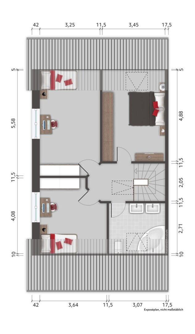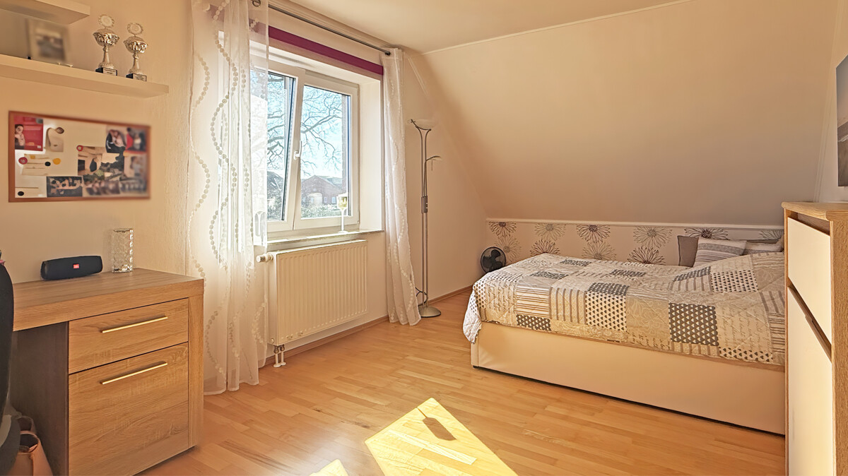 Im Obergeschoss setzt sich der gepflegte Gesamteindruck fort. Das helle Badezimmer ist mit Badewanne, separater Dusche und zwei Waschbecken komfortabel ausgestattet. Ein Dachflächenfenster sorgt auch hier für angenehmes Tageslicht. Die Zimmer überzeugen durch ihre freundliche Ausstrahlung, gute Möblierbarkeit sowie einen warmen Holzfußboden.
