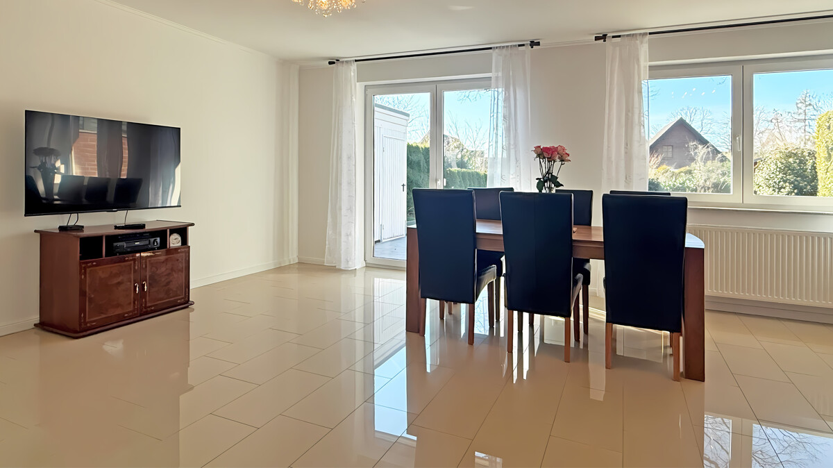 Das großzügige Wohnzimmer besticht durch seine lichtdurchflutete Gestaltung. Große Fensterflächen und der direkte Zugang zur Terrasse schaffen eine offene, einladende Wohnatmosphäre. Der hochwertige, glänzende Fliesenboden unterstreicht die klare Linienführung und bietet eine stilvolle Basis für verschiedenste Einrichtungskonzepte. Von hier aus gelangen Sie nahtlos auf die Terrasse und in den Garten.