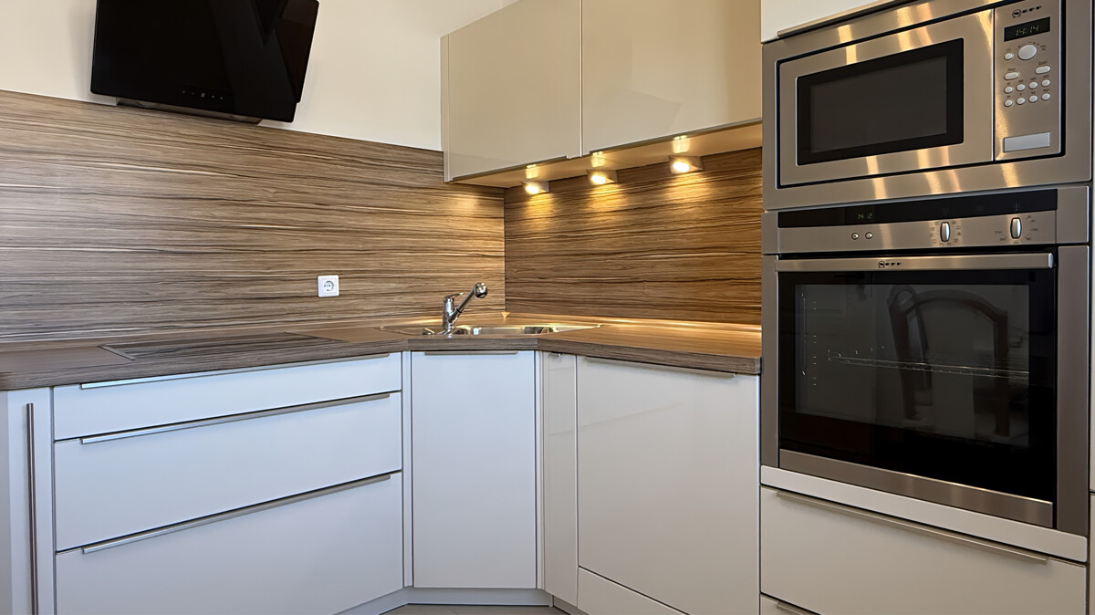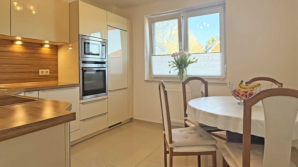 Die Küche präsentiert sich modern und funktional zugleich: Helle Fronten treffen auf warme Holzoptik im Arbeitsbereich und an der Rückwand. Integrierte Einbaugeräte sowie die Möglichkeit für einen Essplatz am Fenster machen sie zu einem praktischen Mittelpunkt im Alltag.