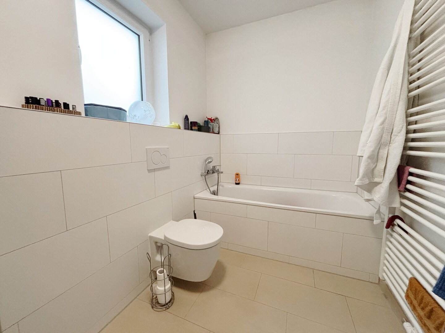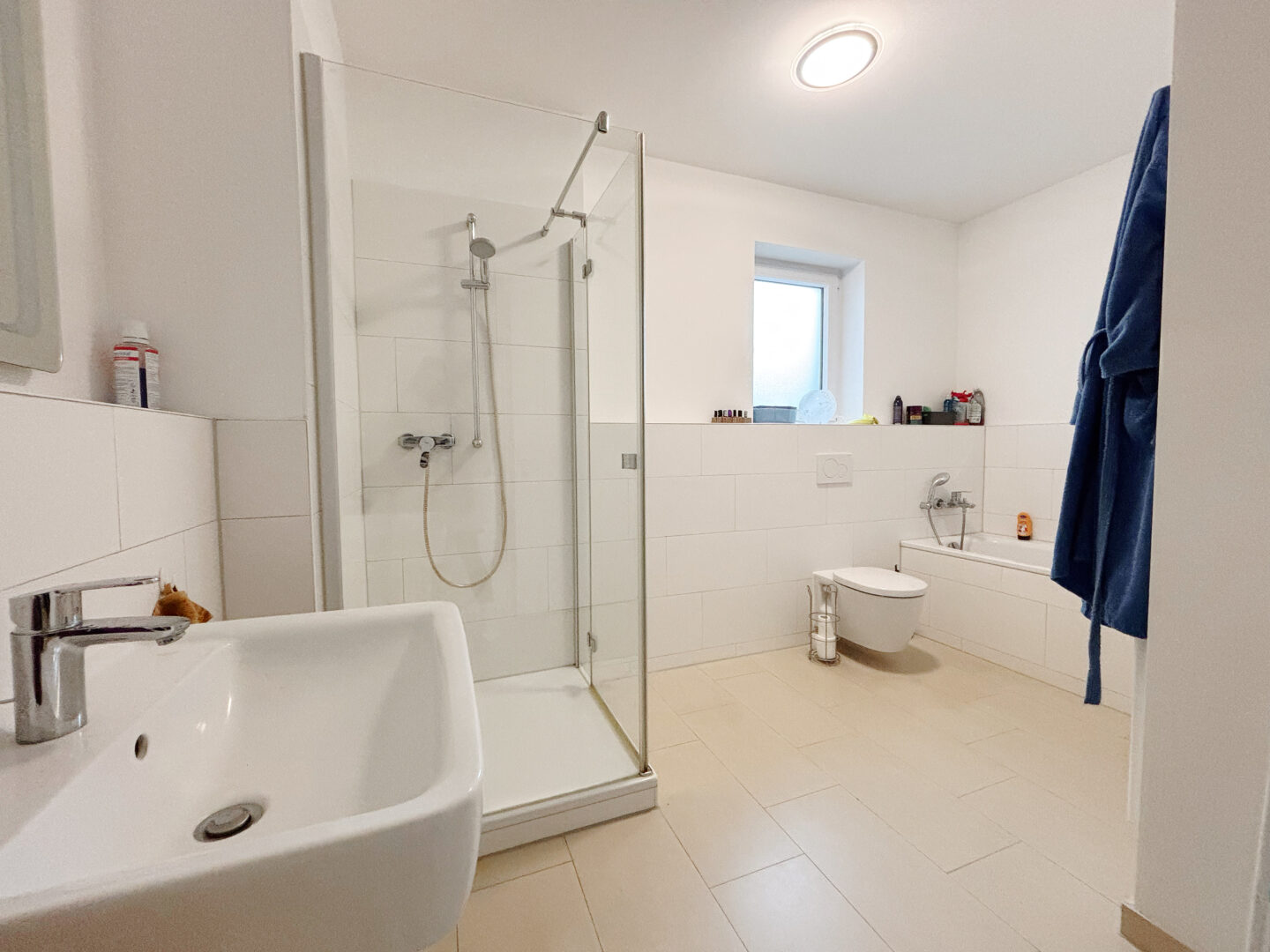 Das modern geflieste Vollbad ist hochwertig ausgestattet und verfügt sowohl über eine Badewanne als auch eine separate Dusche. Ein Fenster sorgt für ausreichend Tageslicht und eine optimale Belüftung. Ergänzend steht ein separates Gäste-WC zur Verfügung, das den Wohnkomfort zusätzlich erhöht.