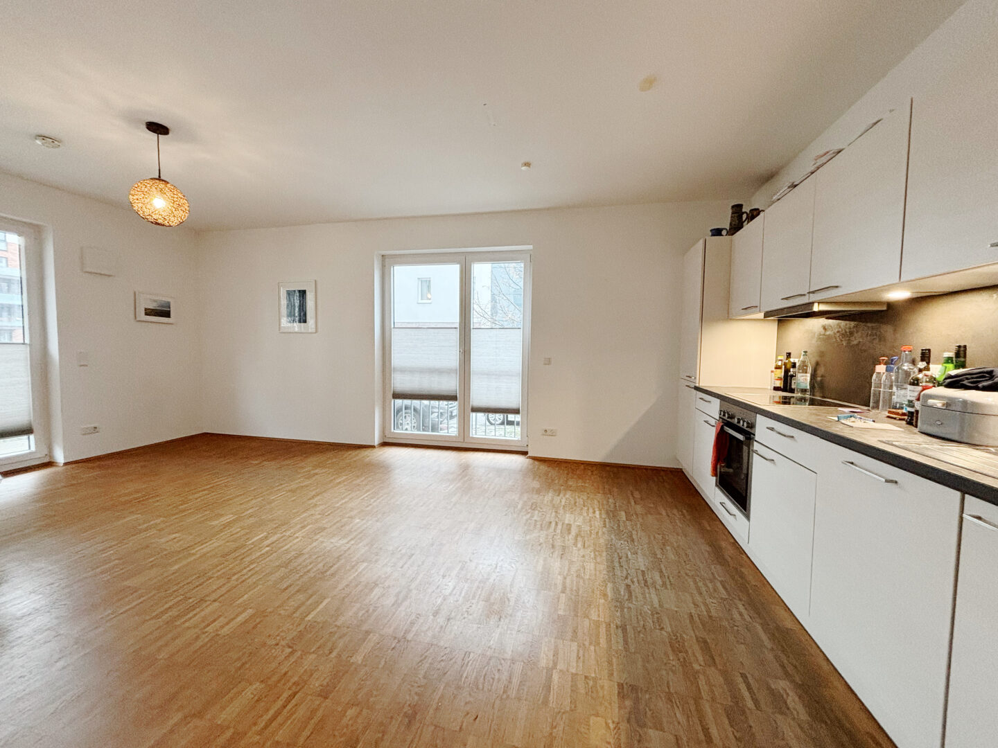 Die offene, voll ausgestattete Einbauküche ist zum Wohnzimmer hin offen gestaltet und fügt sich harmonisch in den Wohnbereich ein. Sie bietet moderne Elektrogeräte sowie ausreichend Stauraum und bildet den zentralen Treffpunkt für gemeinsames Kochen und Wohnen.