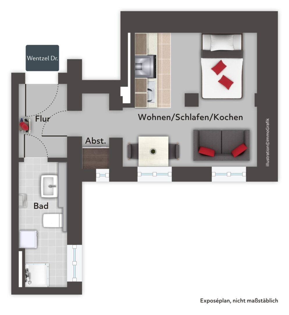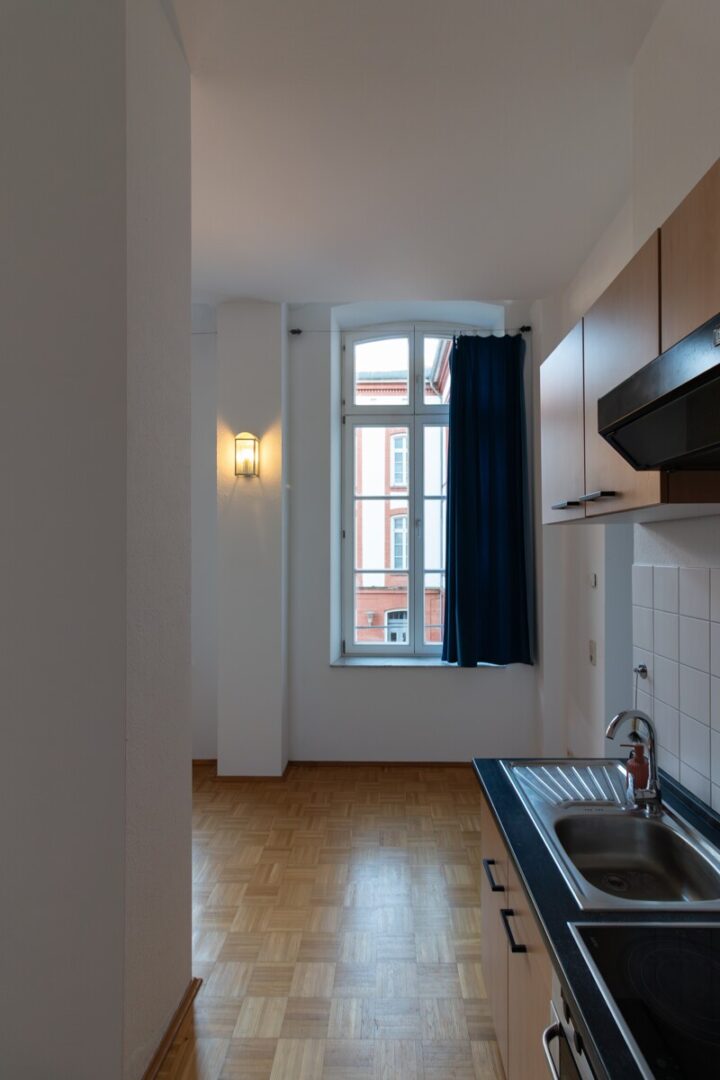 Das Wohn und Esszimmer bildet den Mittelpunkt der Wohnung und bündelt Wohnen, Essen und Arbeiten in einem Raum. Die Fläche ist so geschnitten, dass sich je nach Bedarf ein Schlafbereich, ein Arbeitsplatz oder eine kleine Esszone integrieren lässt. Direkt anschließend liegt der Bereich, der sich für die Küche eignet.