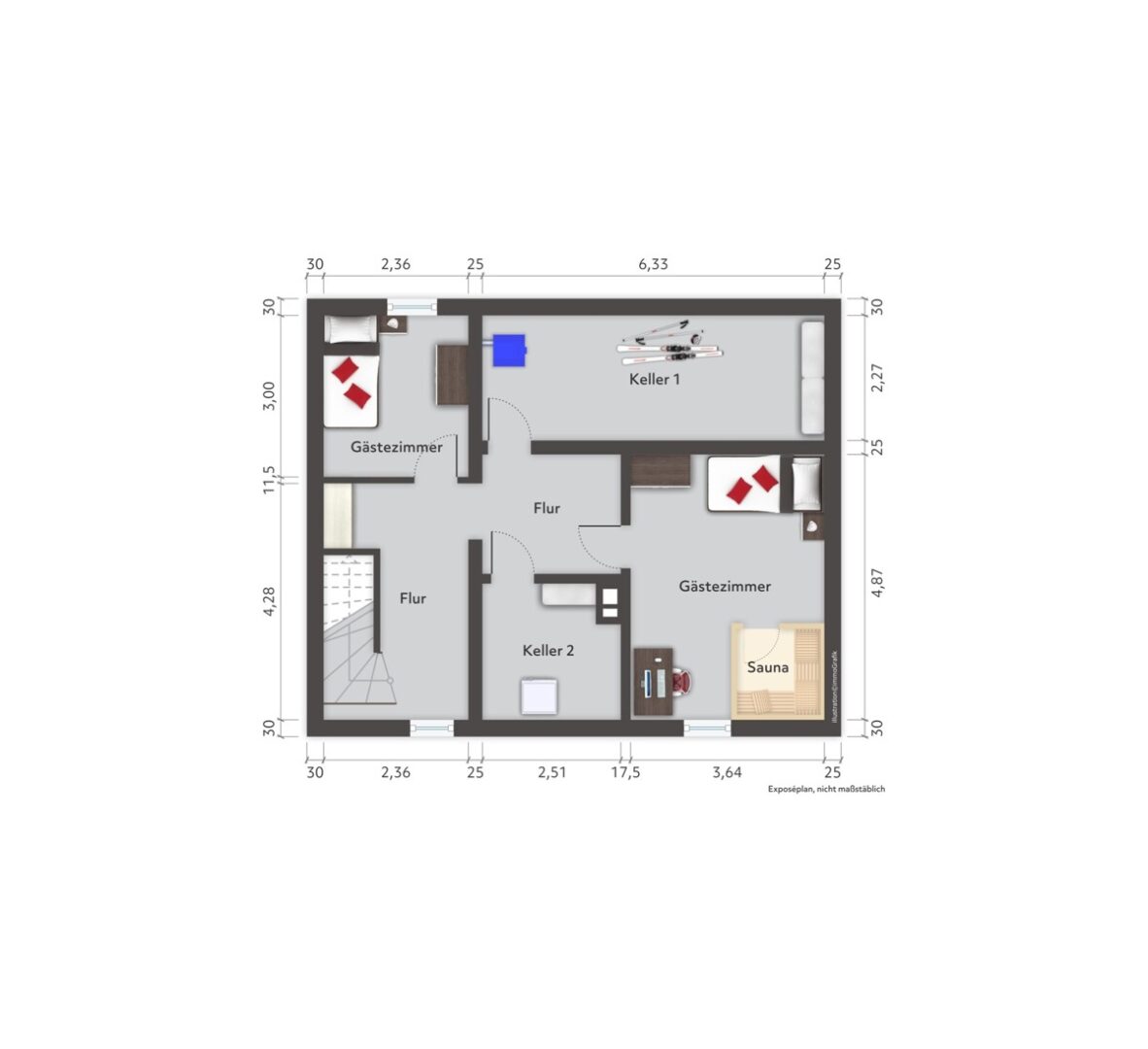 Das Badezimmer ist hell gefliest und mit Badewanne sowie Dusche ausgestattet. Der Keller bietet zusätzliche Fläche für Vorräte, Hobby oder Hauswirtschaft und unterstützt damit eine aufgeräumte Wohnorganisation.