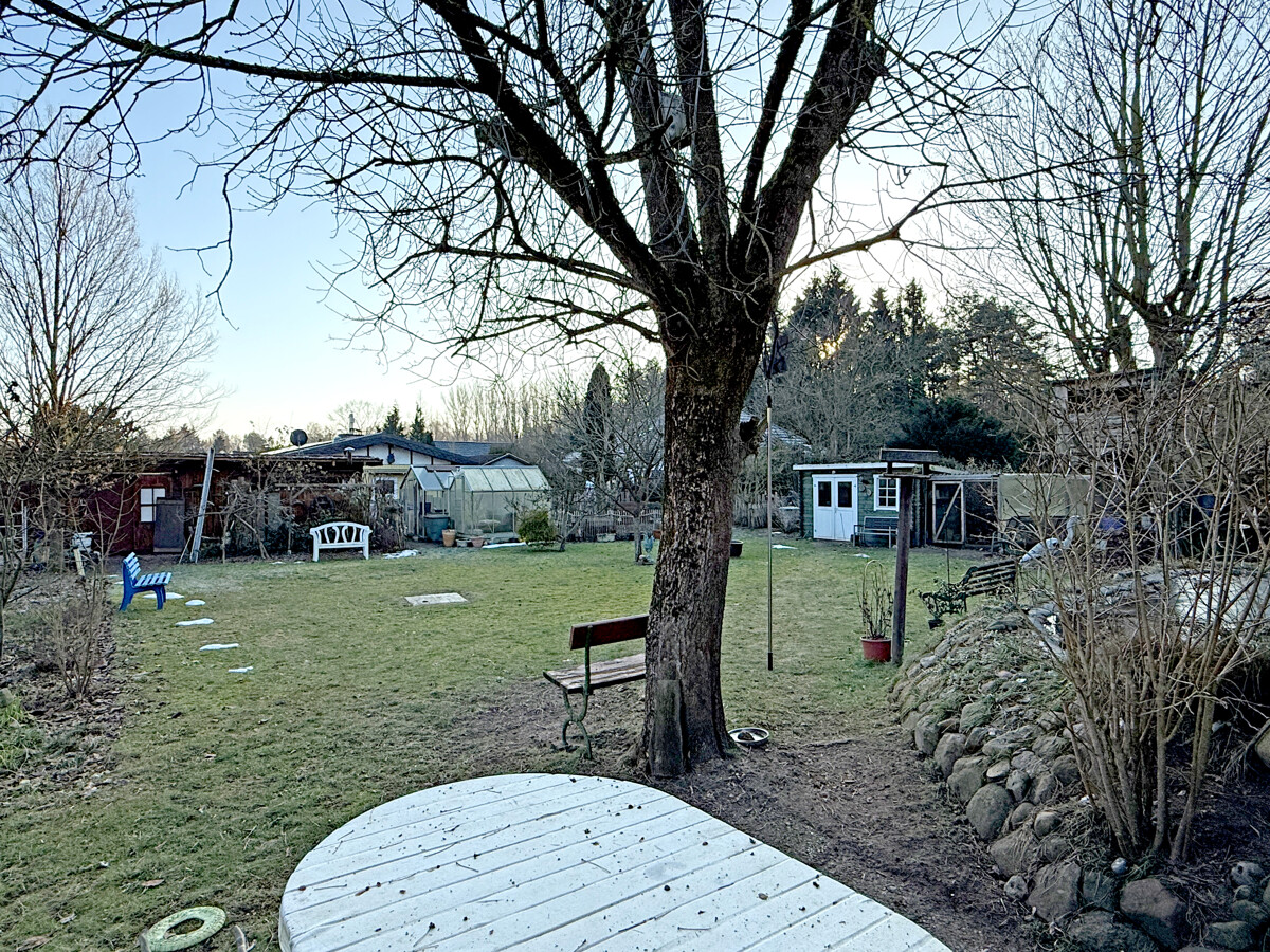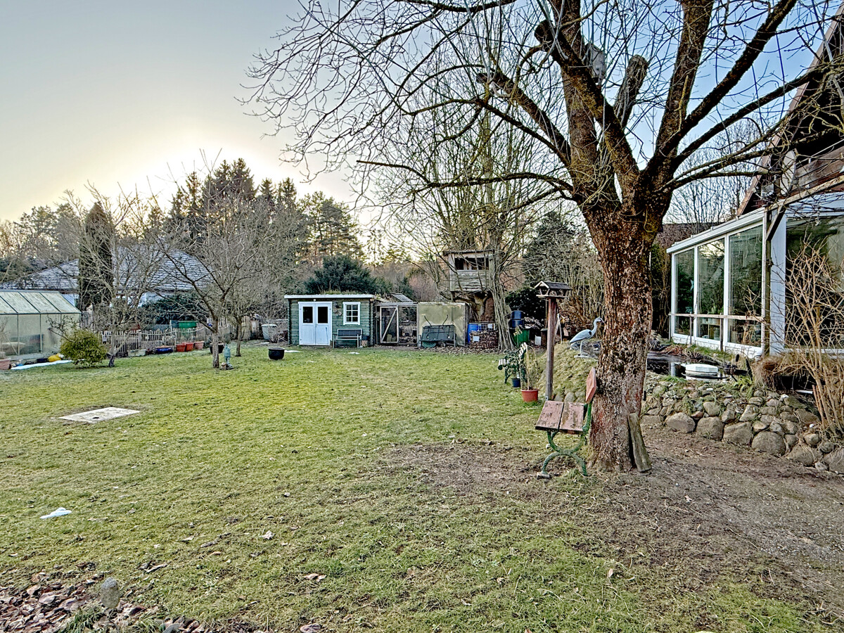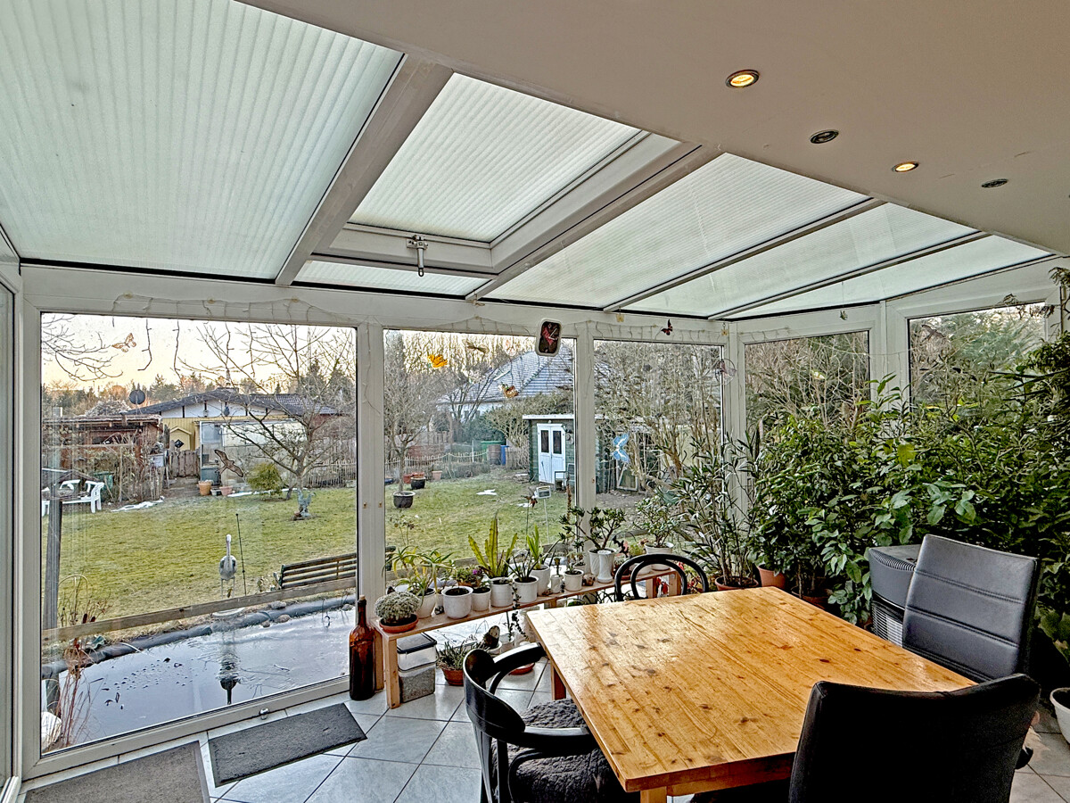 Der Wintergarten wirkt wie ein zweites Wohnzimmer mit viel Glas und einer besonderen Nähe zum Außenbereich. Er eignet sich als Essplatz, Lesezone oder als ruhiger Bereich neben dem Familienleben. Der Garten präsentiert sich weitläufig und bietet Platz für unterschiedliche Nutzungen, vom Spielen bis zum Gärtnern.
