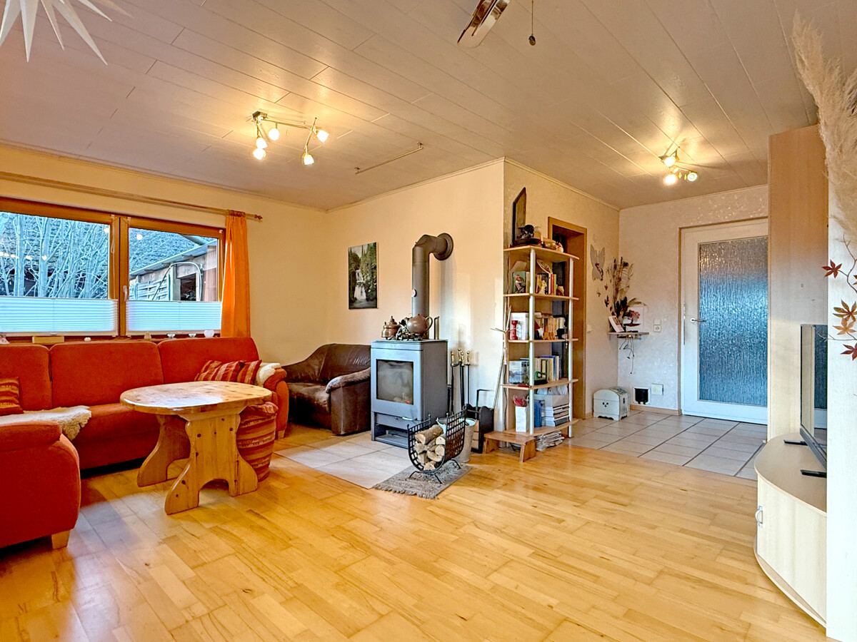 Nach dem Ankommen führt der Wohnbereich als zentraler Treffpunkt durch den Tag. Große Fensterflächen sorgen für eine angenehme Helligkeit, während der Kaminofen dem Raum eine behagliche, wohnliche Note verleiht. Von hier aus entsteht ein fließender Übergang in den Wintergarten, der den Blick in den Garten öffnet.