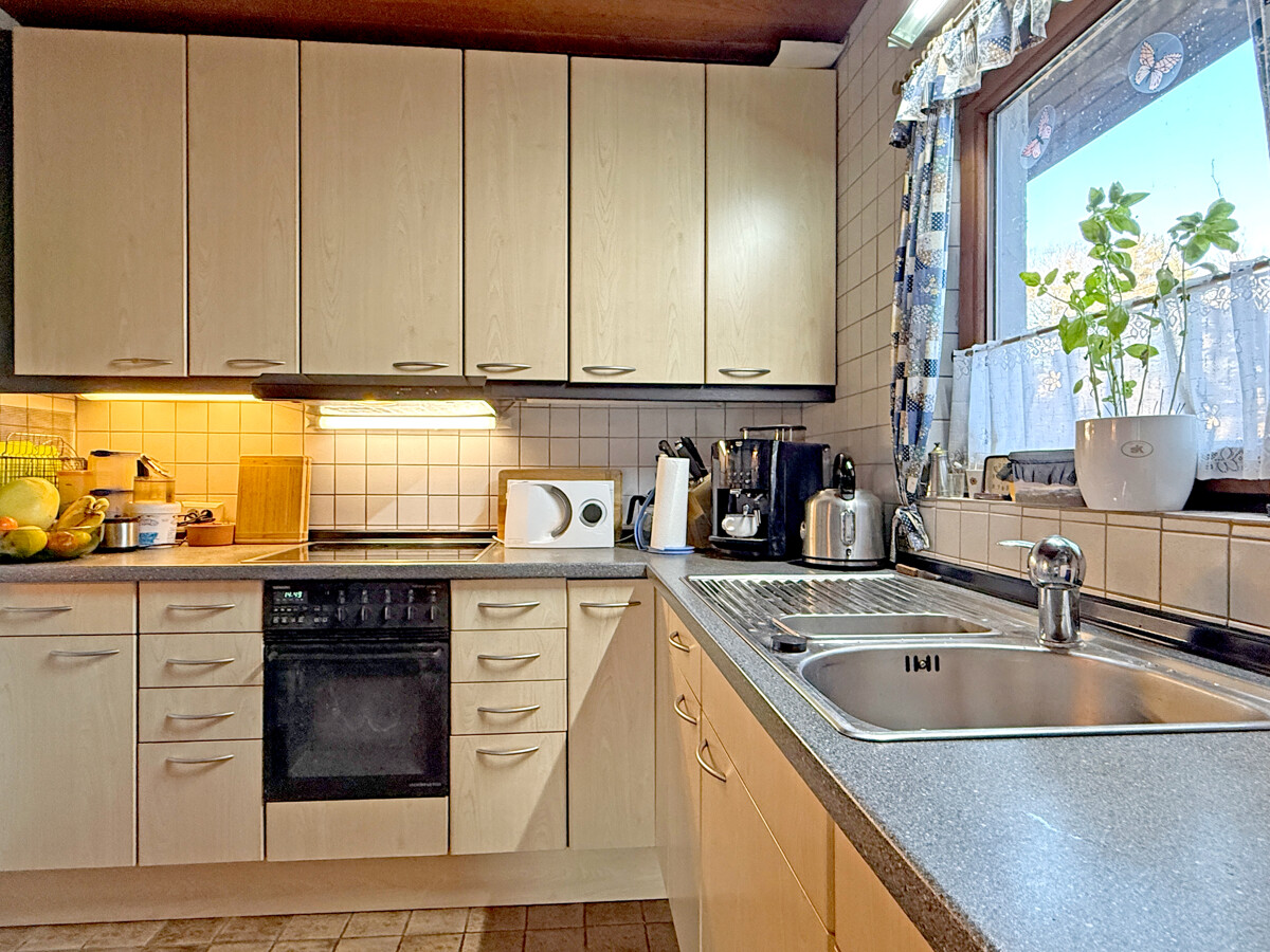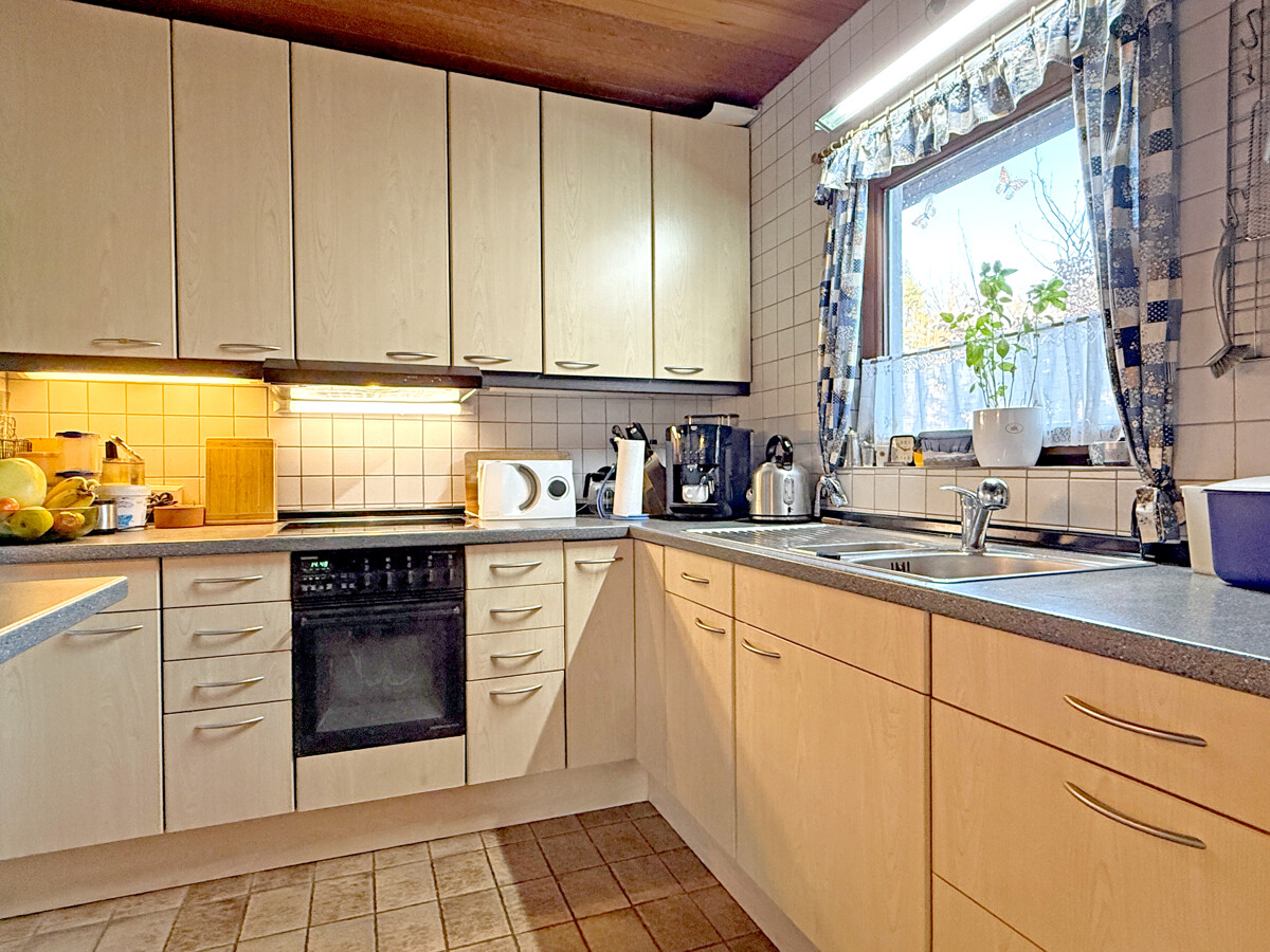 Die Küche ist funktional geschnitten und bietet eine solide Grundlage für den täglichen Ablauf. Helle Fronten und eine großzügige Arbeitsfläche unterstützen eine praktische Nutzung im Familienalltag.