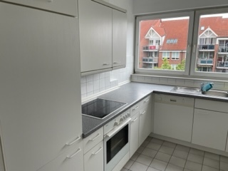 Von dort aus gelangt man in die Wohnküche, die als funktionale Küchenzeile gestaltet ist. Helle Fronten, ein Fliesenspiegel und die integrierten Elektrogeräte sorgen für eine aufgeräumte Optik und kurze Wege im täglichen Ablauf.