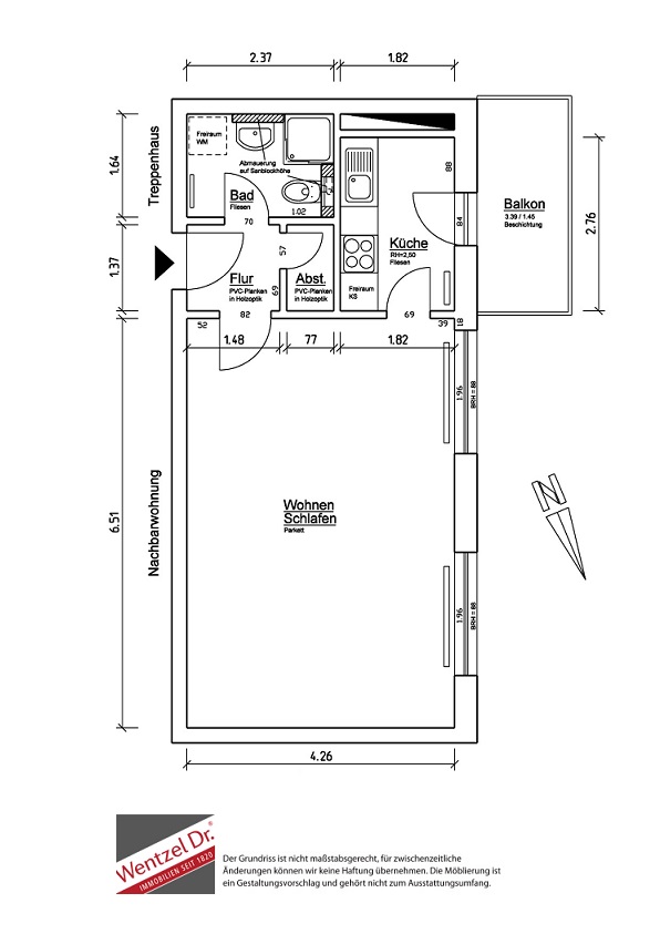 Die Wohnung verfügt über einen optimalen Grundriss. Ideal für Singles oder Studenten.