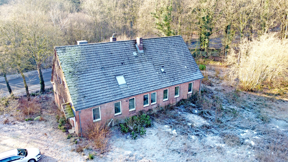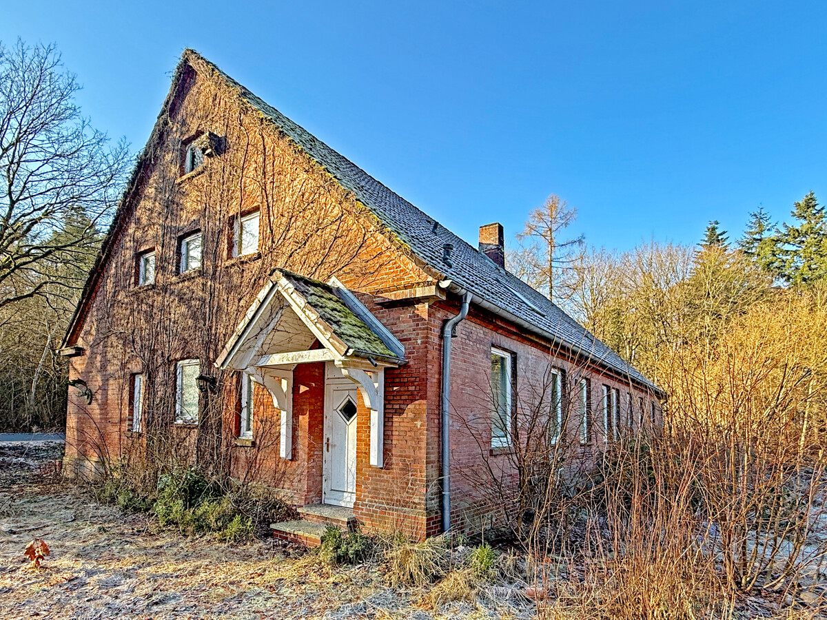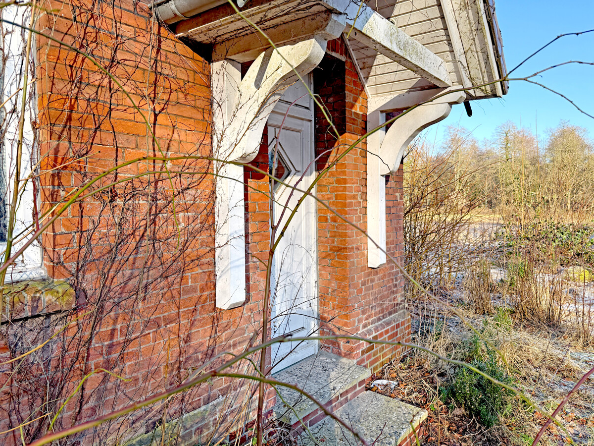 Der Baukörper präsentiert sich als klassisches, massiv wirkendes Backsteingebäude mit markantem Satteldach und prägnanter Giebelfront. Der Eingangsbereich ist über einen kleinen, überdachten Vorbau erschlossen, der dem Haus eine klare Adresse und einen geschützten Zugang gibt. Die Außenansichten zeigen zudem einen gewachsenen Charakter mit sichtbarer Patina, der den historischen Ursprung nachvollziehbar macht.