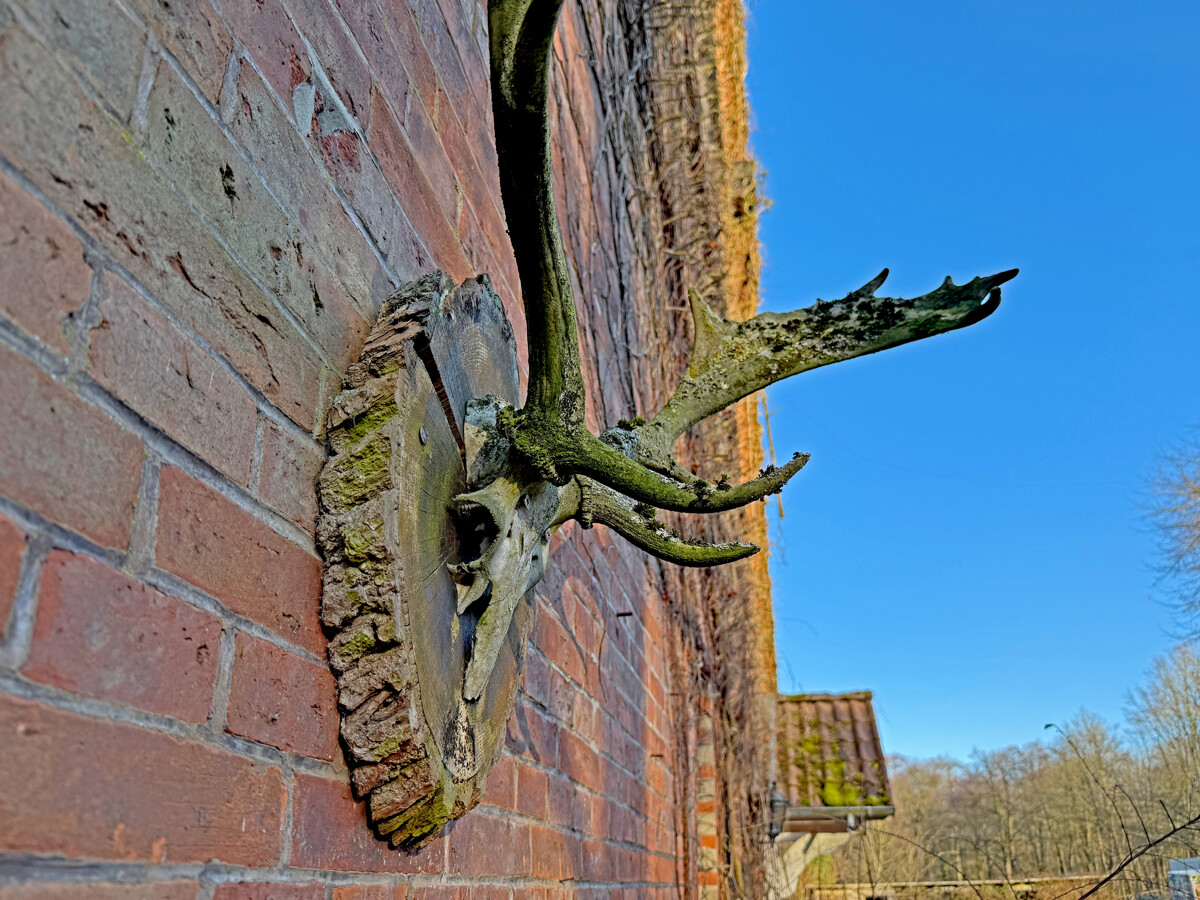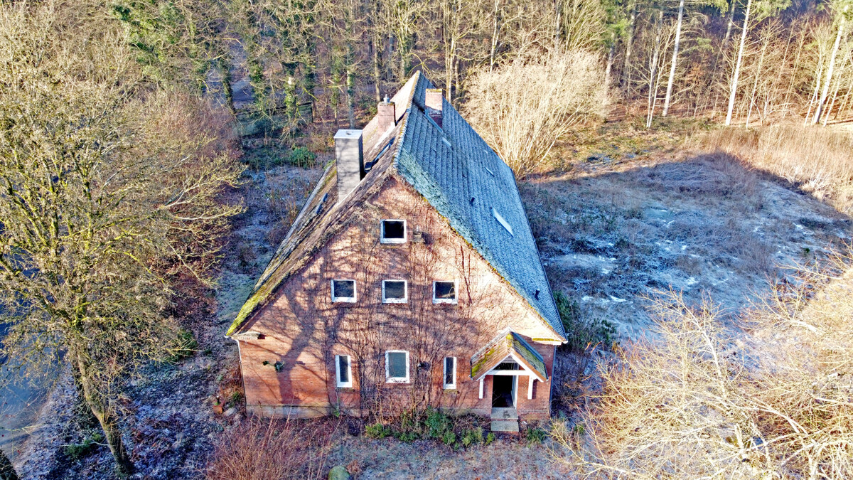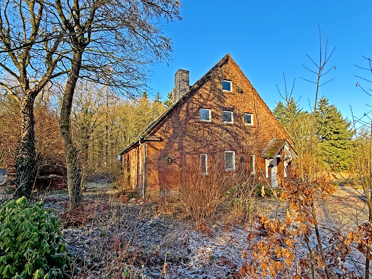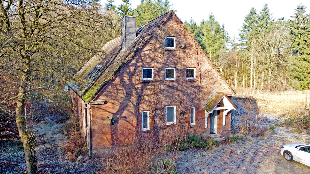 Der Baukörper präsentiert sich als klassisches, massiv wirkendes Backsteingebäude mit markantem Satteldach und prägnanter Giebelfront. Der Eingangsbereich ist über einen kleinen, überdachten Vorbau erschlossen, der dem Haus eine klare Adresse und einen geschützten Zugang gibt. Die Außenansichten zeigen zudem einen gewachsenen Charakter mit sichtbarer Patina, der den historischen Ursprung nachvollziehbar macht.