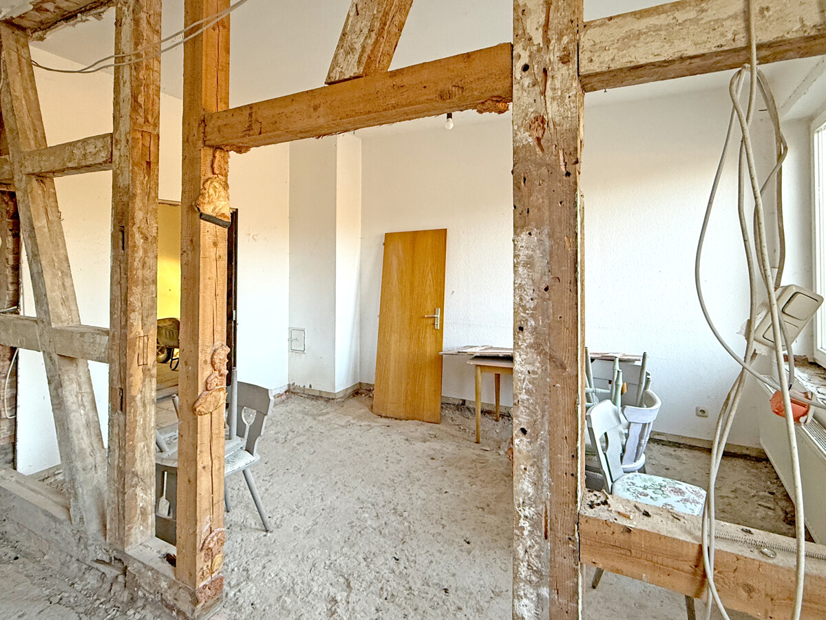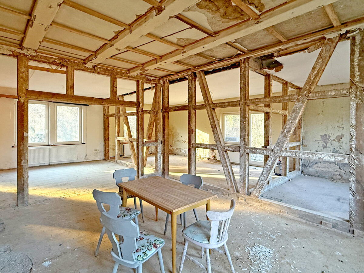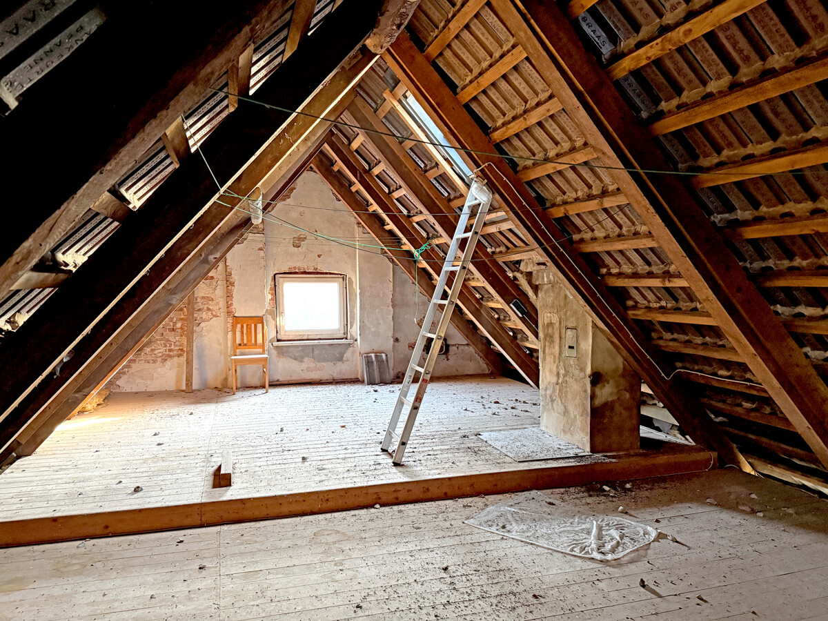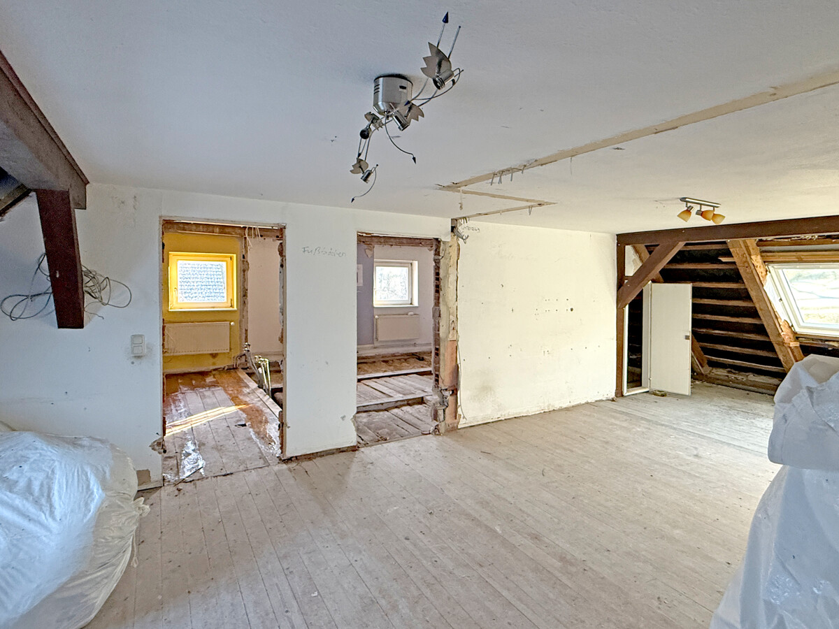 Im Inneren wird ein Zustand sichtbar, der auf eine umfassende Modernisierung und Neuordnung der Flächen ausgerichtet ist. Teilweise sind Wand- und Deckenbereiche geöffnet, wodurch tragende Strukturen und Raumzuschnitte gut erkennbar werden. In einzelnen Bereichen sind freigelegte Konstruktionen und Ausbauzustände sichtbar, was eine strukturierte Planung der nächsten Schritte erleichtern kann. Der Dachraum zeigt eine offene, weit gespannte Fläche mit sichtbaren Holzelementen, die sich als zusätzliche Nutzreserve anbietet.