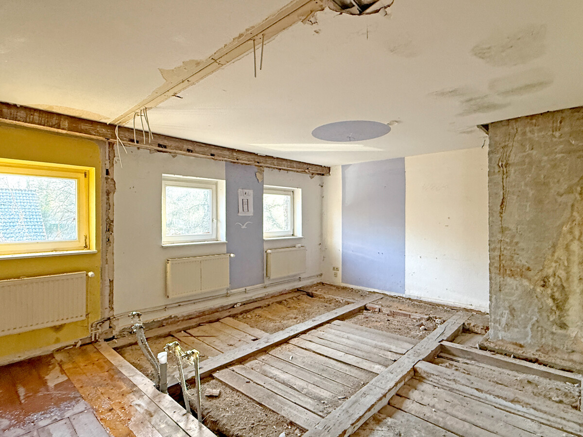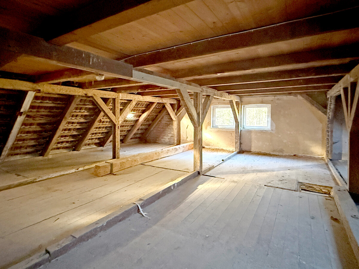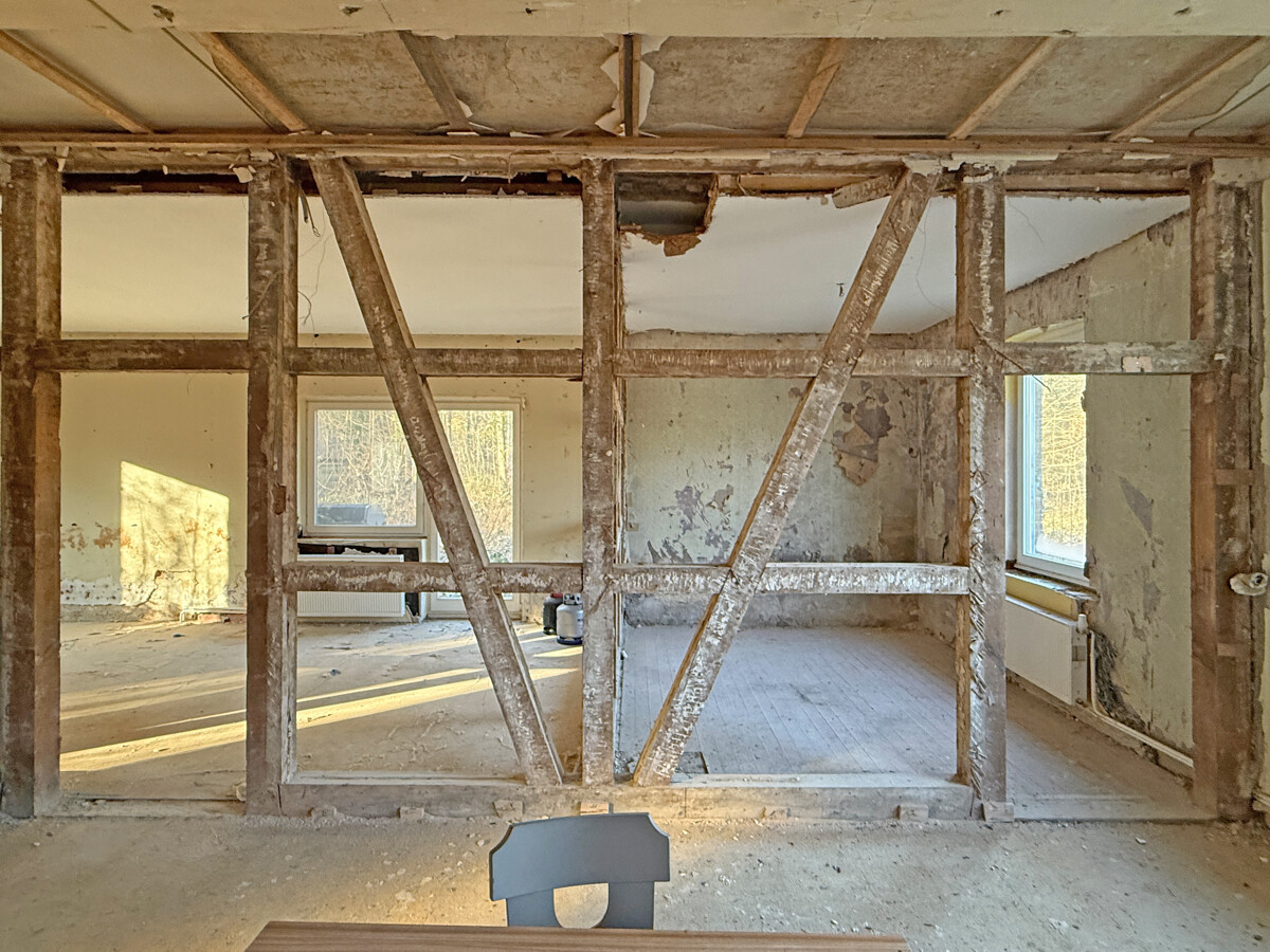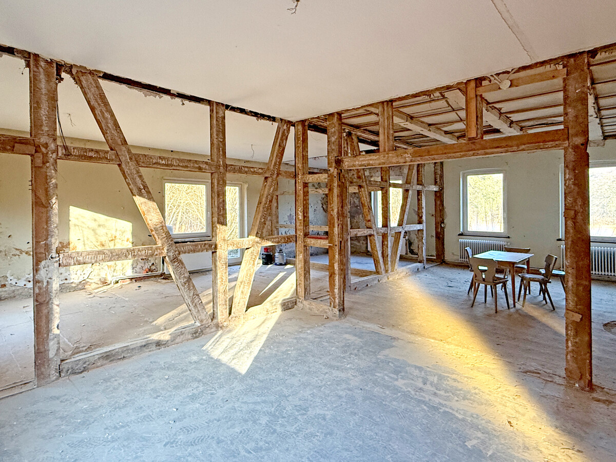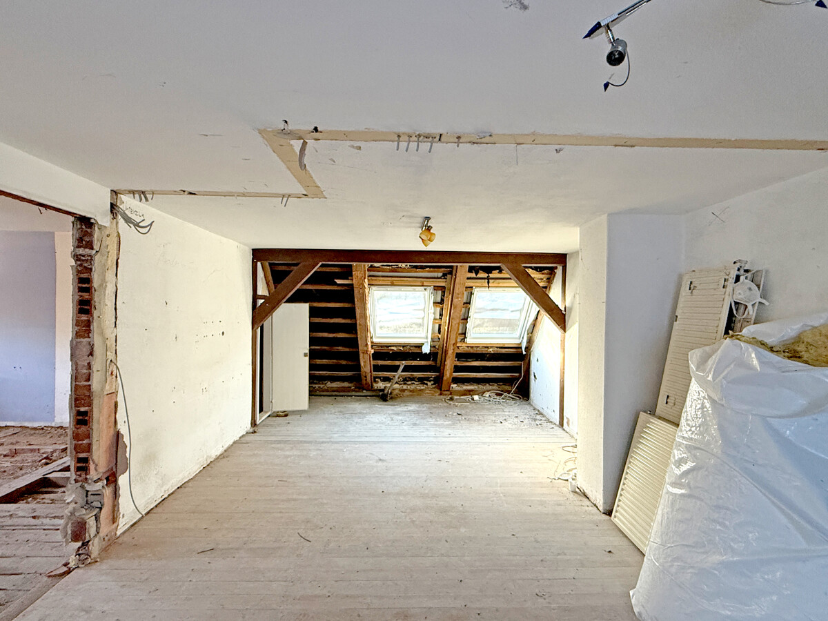 Im Inneren wird ein Zustand sichtbar, der auf eine umfassende Modernisierung und Neuordnung der Flächen ausgerichtet ist. Teilweise sind Wand- und Deckenbereiche geöffnet, wodurch tragende Strukturen und Raumzuschnitte gut erkennbar werden. In einzelnen Bereichen sind freigelegte Konstruktionen und Ausbauzustände sichtbar, was eine strukturierte Planung der nächsten Schritte erleichtern kann. Der Dachraum zeigt eine offene, weit gespannte Fläche mit sichtbaren Holzelementen, die sich als zusätzliche Nutzreserve anbietet.