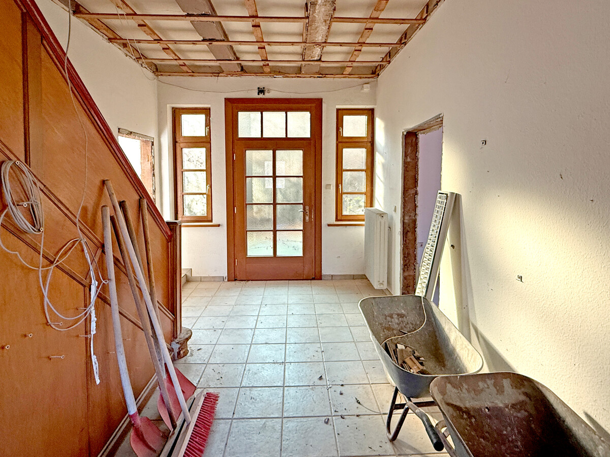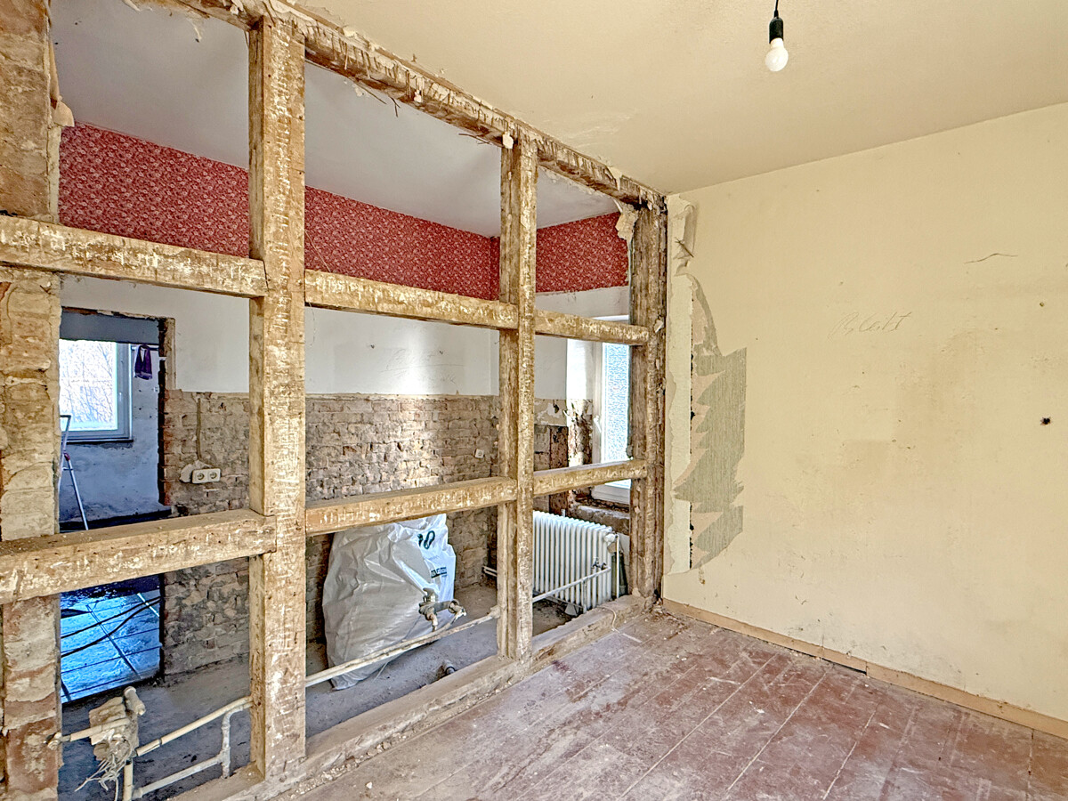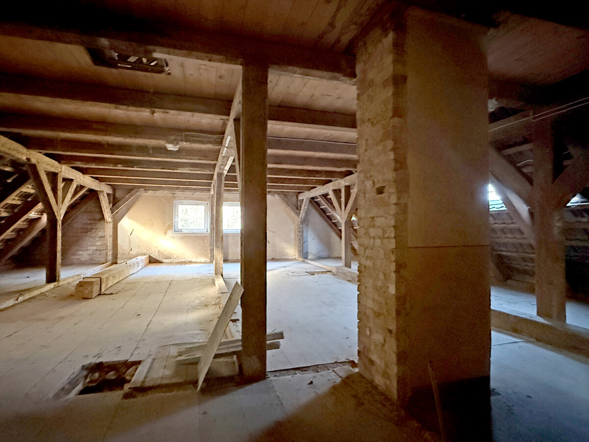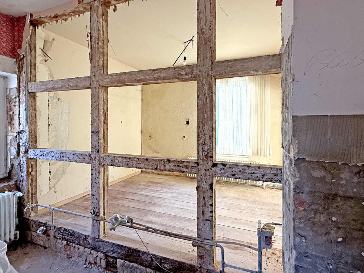 Im Inneren wird ein Zustand sichtbar, der auf eine umfassende Modernisierung und Neuordnung der Flächen ausgerichtet ist. Teilweise sind Wand- und Deckenbereiche geöffnet, wodurch tragende Strukturen und Raumzuschnitte gut erkennbar werden. In einzelnen Bereichen sind freigelegte Konstruktionen und Ausbauzustände sichtbar, was eine strukturierte Planung der nächsten Schritte erleichtern kann. Der Dachraum zeigt eine offene, weit gespannte Fläche mit sichtbaren Holzelementen, die sich als zusätzliche Nutzreserve anbietet.