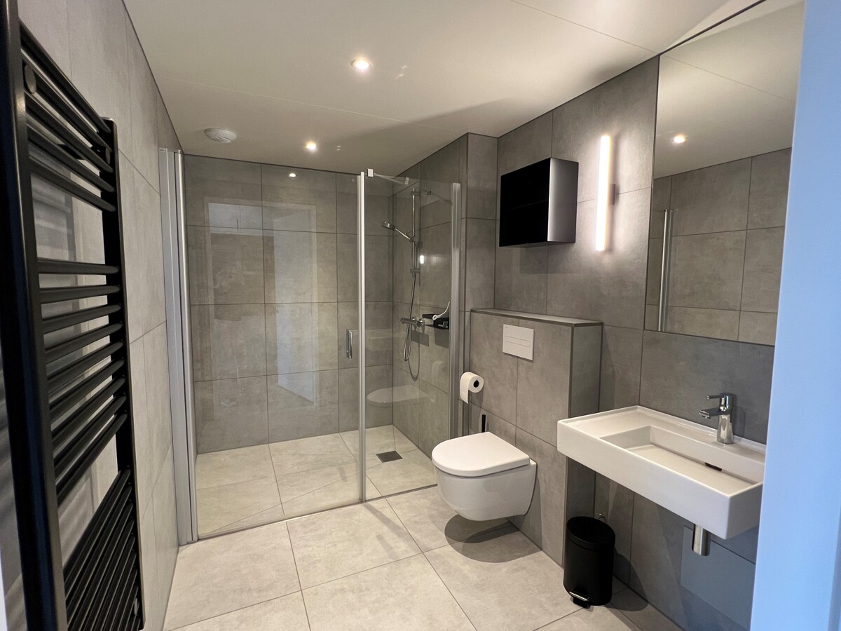 Das Badezimmer ist modern gestaltet und verfügt neben hellen Fliesen über eine Walk-In Dusche, ein WC und ein Waschbecken. Ein Handtuchheizkörper in Schwarz rundet das stimmige Design ab.