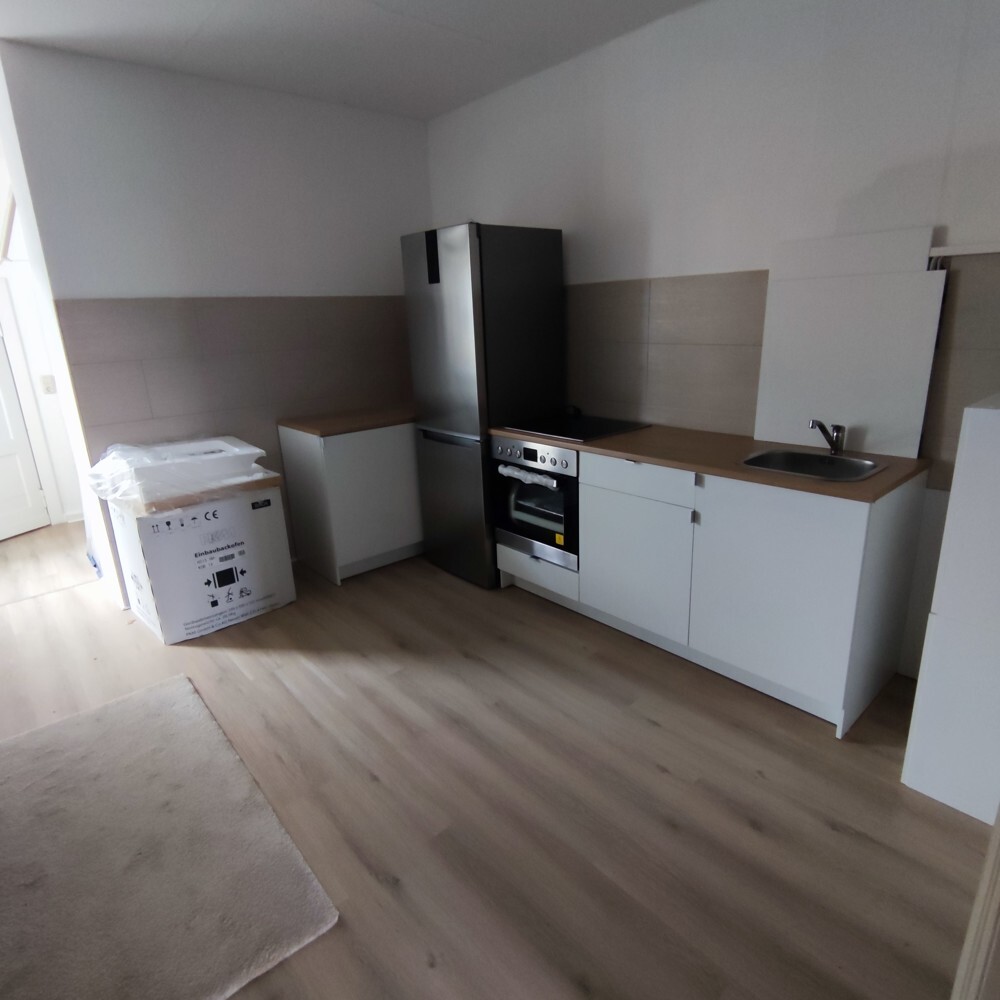 Eine Einbauküche in moderner, geradliniger Ausführung ist vorhanden, mit hellen Fronten und den üblichen Elektrogeräten. Das Bad zeigt eine funktionale Ausstattung.