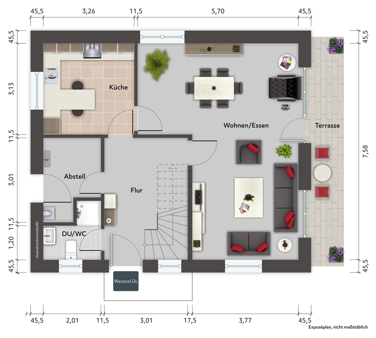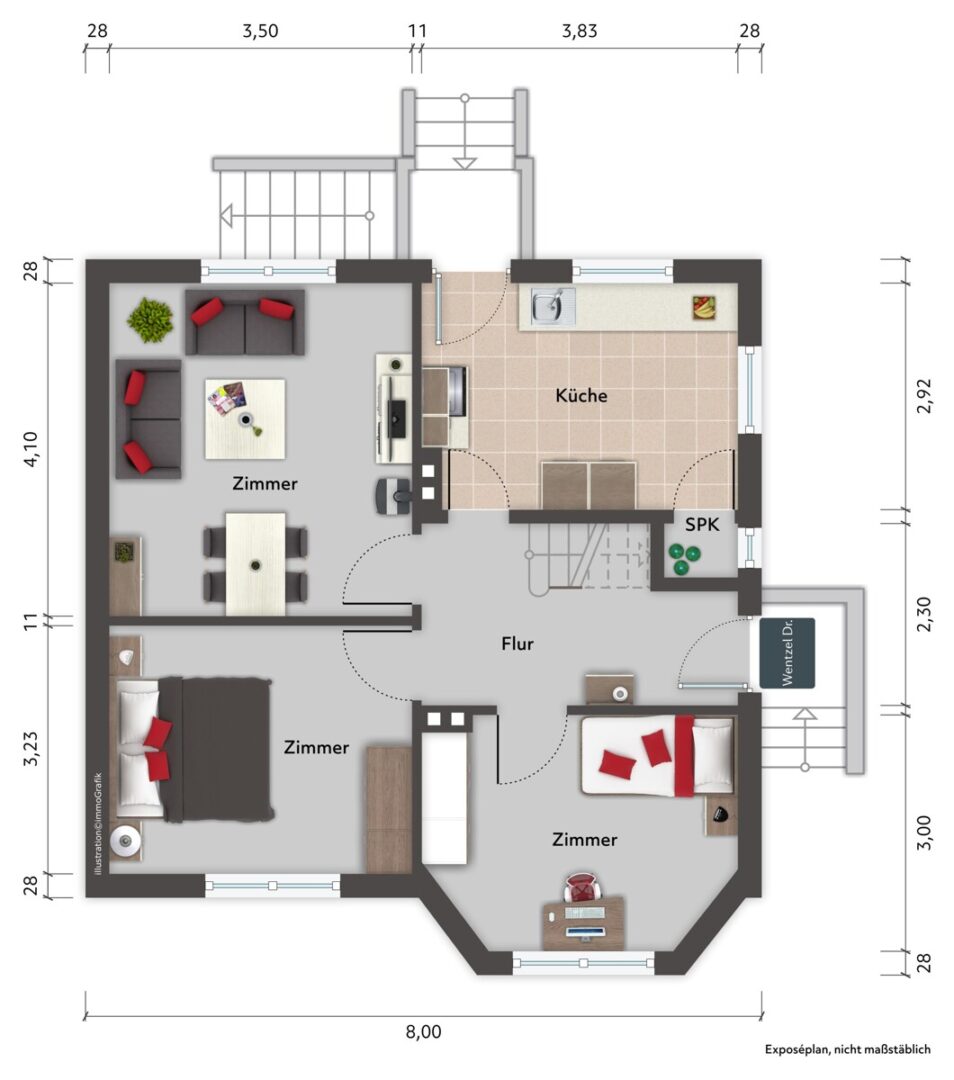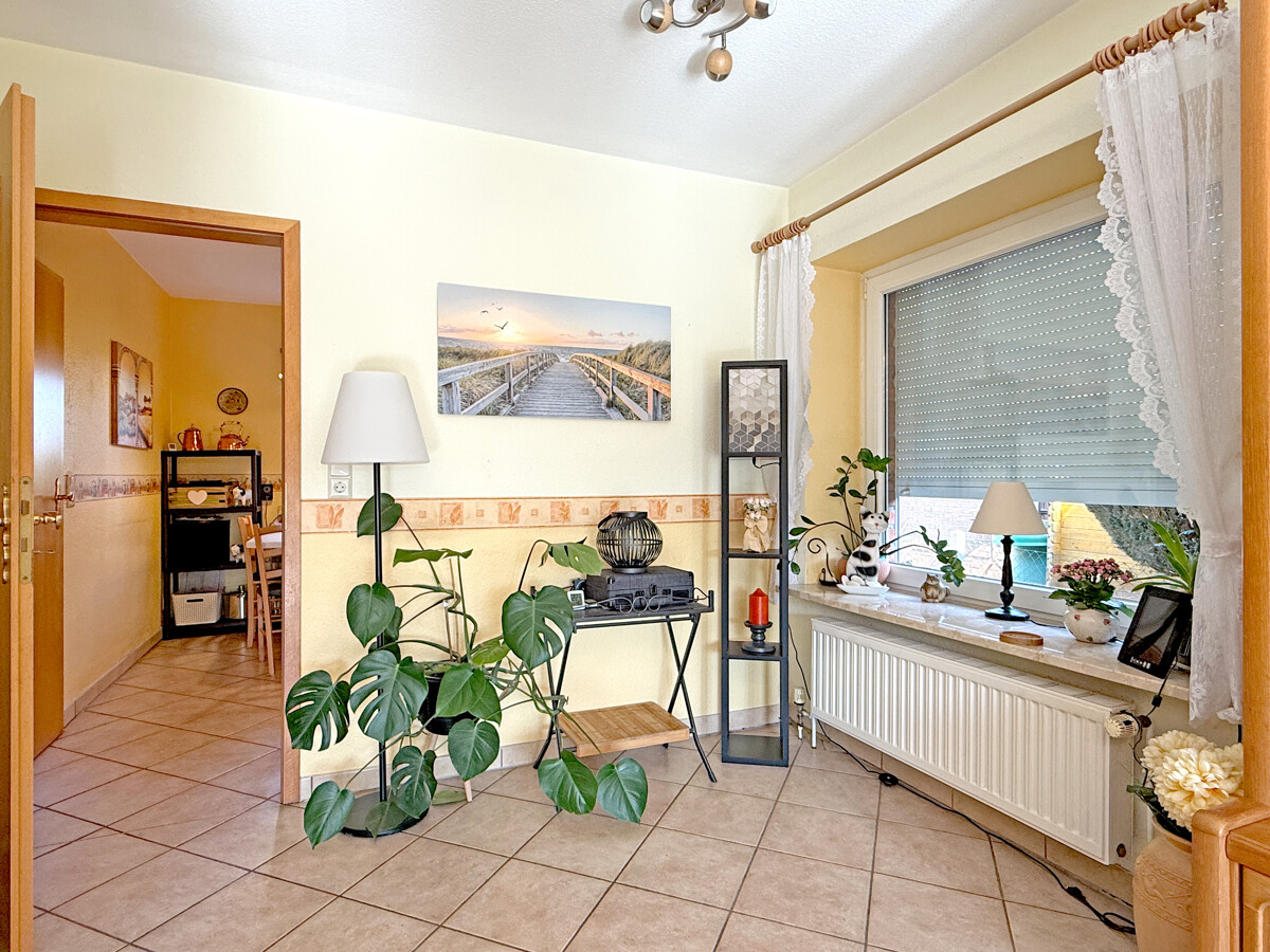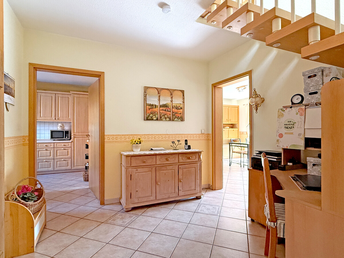 Bereits beim Betreten entsteht ein heller, freundlicher Gesamteindruck mit klaren Sichtachsen in die Wohnbereiche. Der Eingangsbereich wirkt ordentlich und verbindet die Räume im Erdgeschoss auf kurzen Wegen. Von hier aus gelangen Sie direkt in die Küche sowie in den großzügigen Wohn- und Essbereich.
