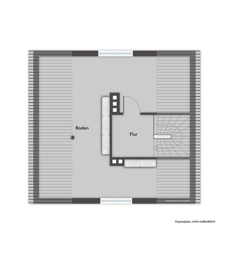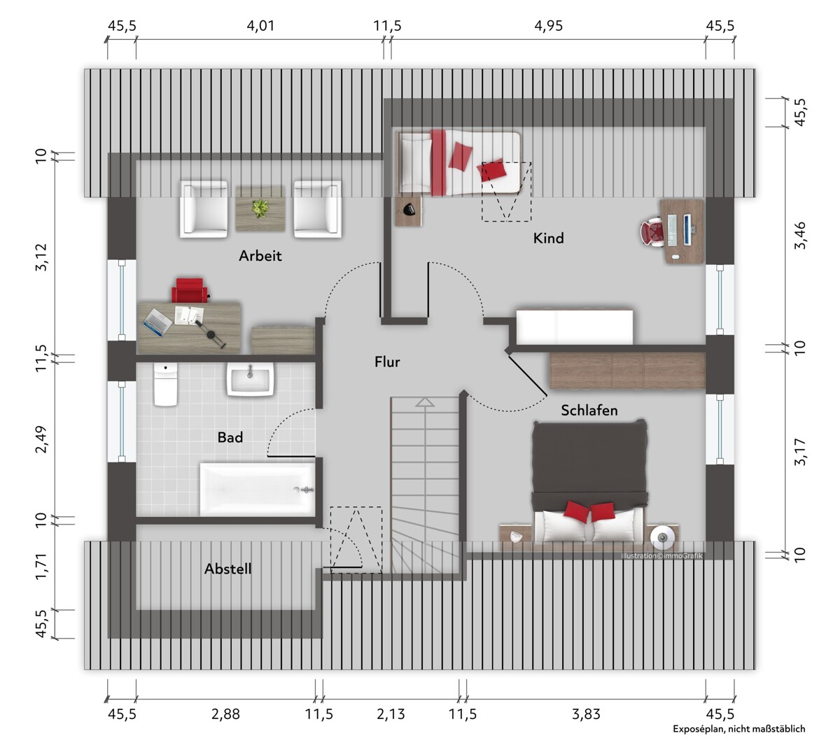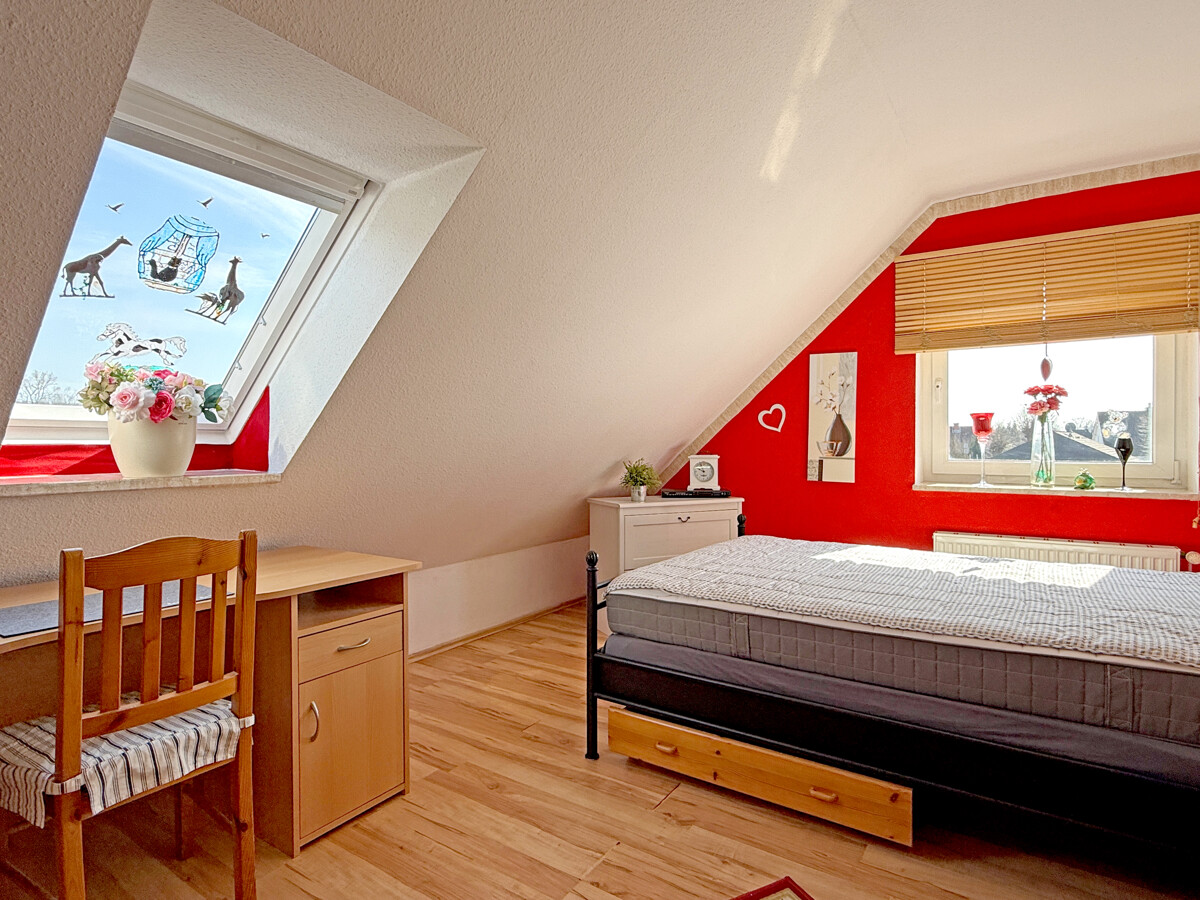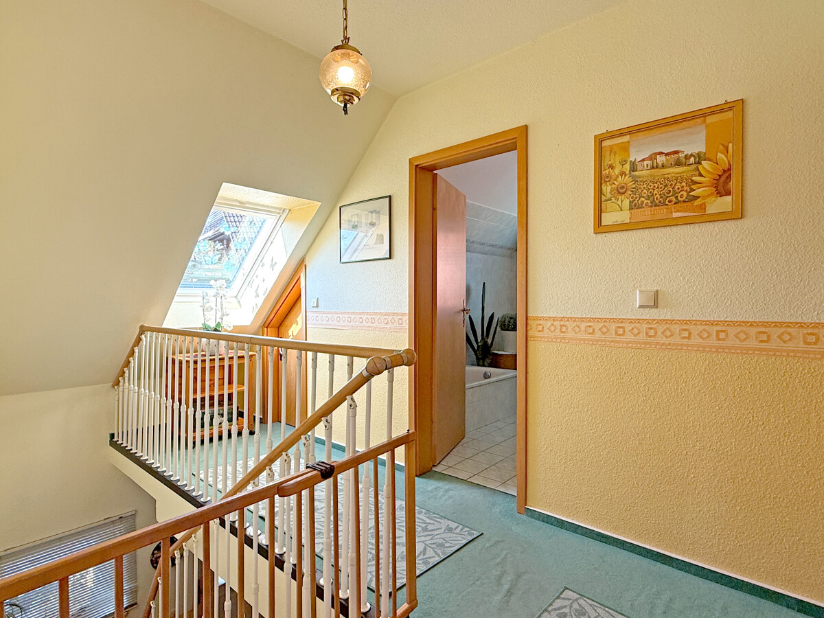 Im Obergeschoss befinden sich drei Zimmer sowie ein Badezimmer. Die Räume eignen sich ideal als Schlaf-, Kinder-, Gästezimmer oder Homeoffice. Dachschrägen und Fensterflächen schaffen eine ruhige, private Atmosphäre.