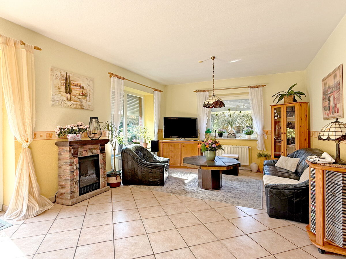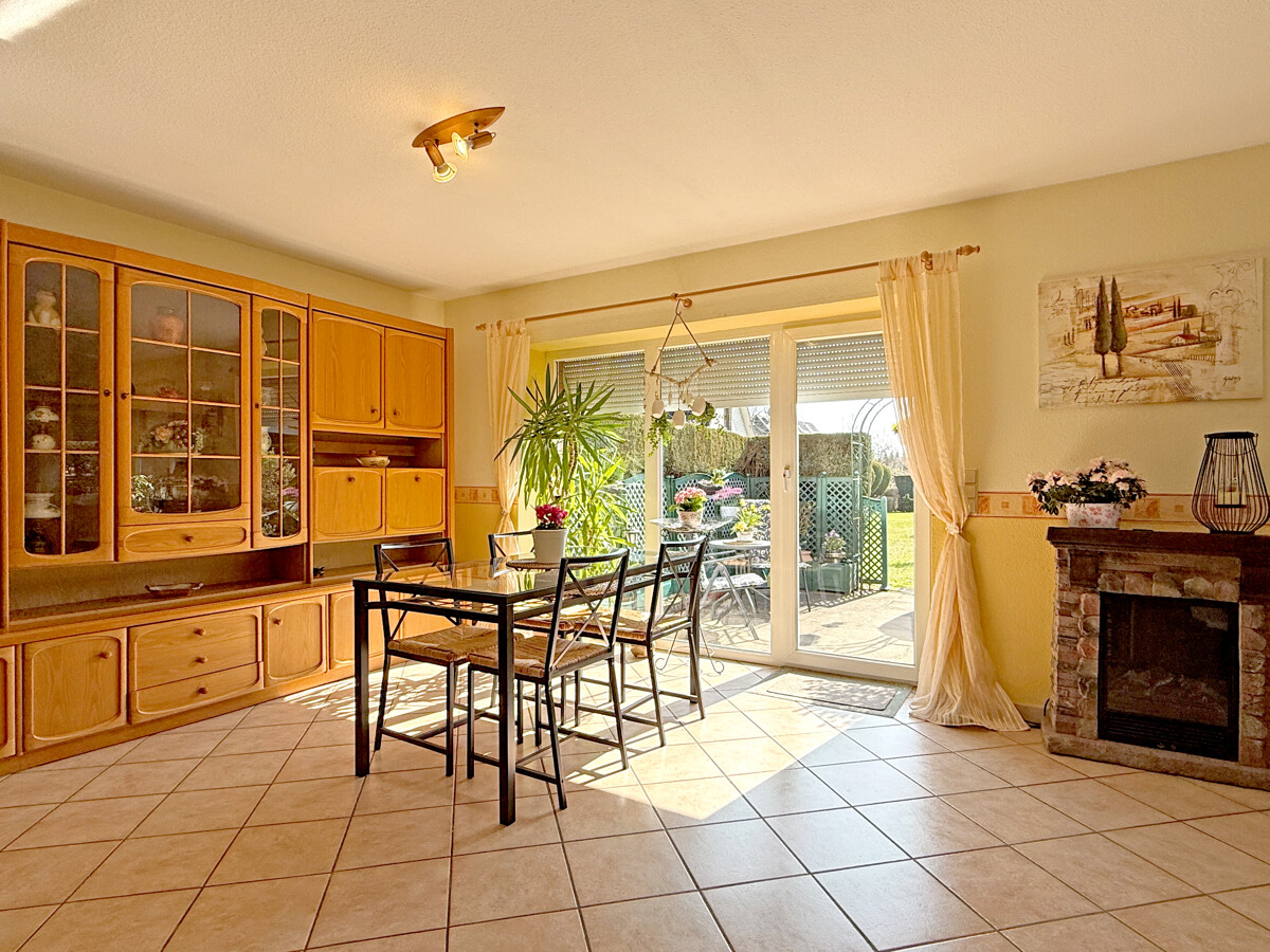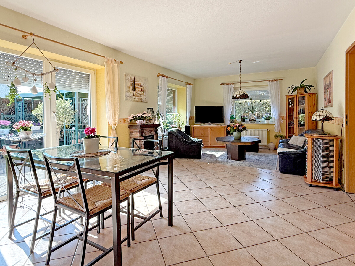 Der Wohn- und Essbereich überzeugt durch große Fensterflächen und eine angenehme Lichtstimmung. Ein Kamin bildet den behaglichen Mittelpunkt und verleiht dem Raum Struktur und Wohnlichkeit. Der direkte Zugang zur Terrasse schafft einen fließenden Übergang in den Außenbereich.
