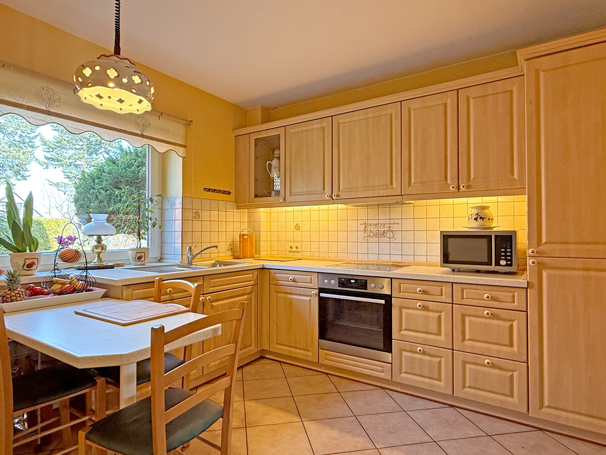 Die Küche ist in L-Form gestaltet und bietet mit zahlreichen Ober- und Unterschränken viel Stauraum. Ein Fenster sorgt für Tageslicht, zudem lässt sich ein kleiner Essplatz integrieren.